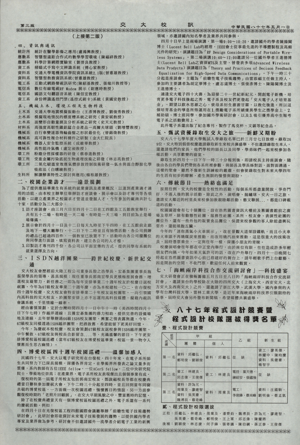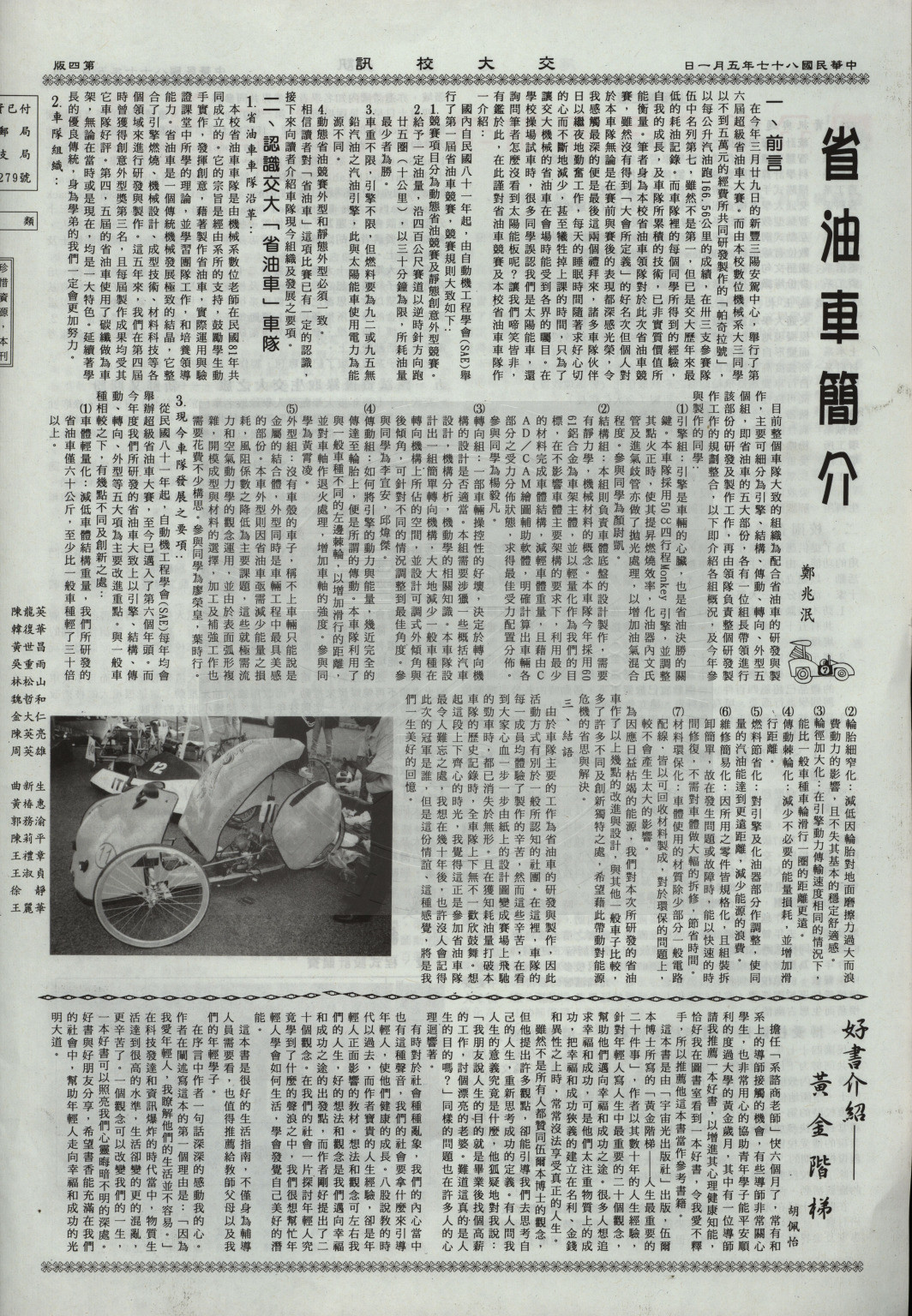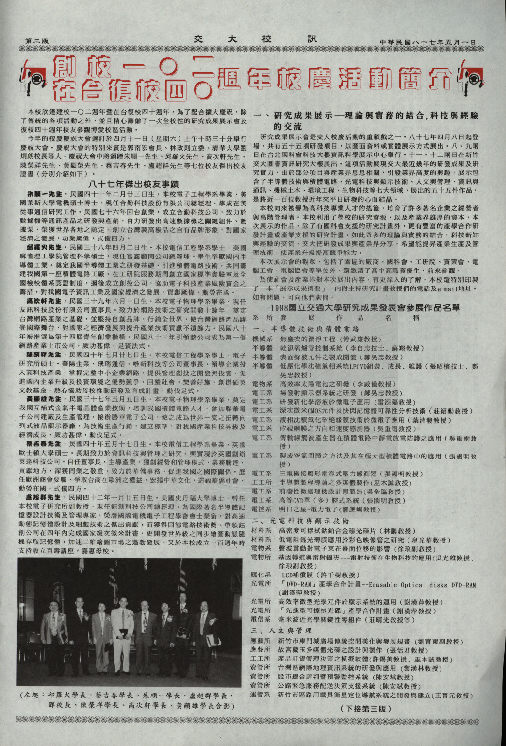 典藏地:交大校區 說明:交大校訊 第九十三期,內容含:為紀念朱蘭成教授 成立「蘭成廳」以為永懷;創校一O二週年校慶活動簡介;八十七年傑出校友事蹟(朱順一、邱羅火、高次軒、陳榮祥、黃顯雄、蔡吉春、盧超群);交大「省油車」簡介等。 資料類型:書刊 典藏號:107-0008-005-093 品名:交大校訊 第九十三期 作者:國立交通大學秘書室編輯 年代:1998 出版者:國立交通大學 數量:1件 稽核資料:四版(4頁) 版本: 印刷品 作品語文: 中文 關鍵詞:交大、校訊 權利聲明:國立陽明交通大學圖書館珍藏資料,如需引用,請註明來源。 取用權:開放