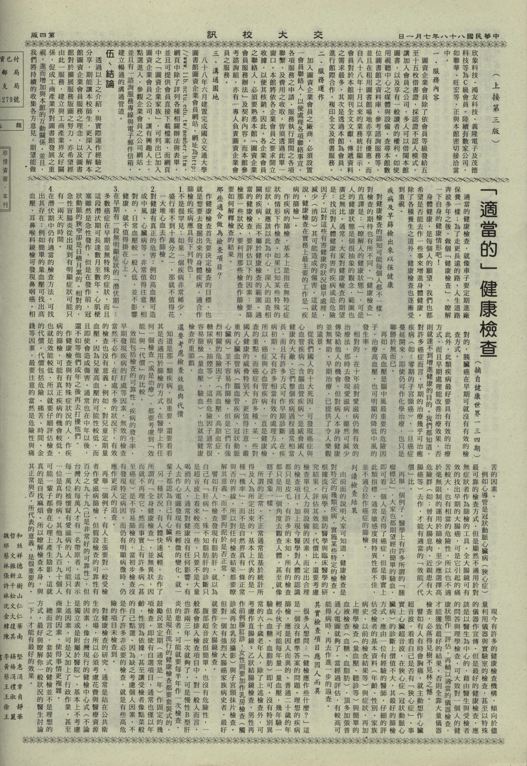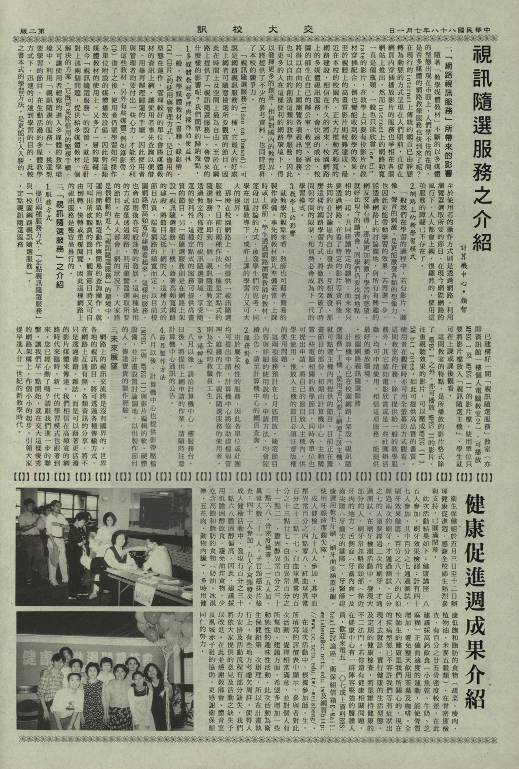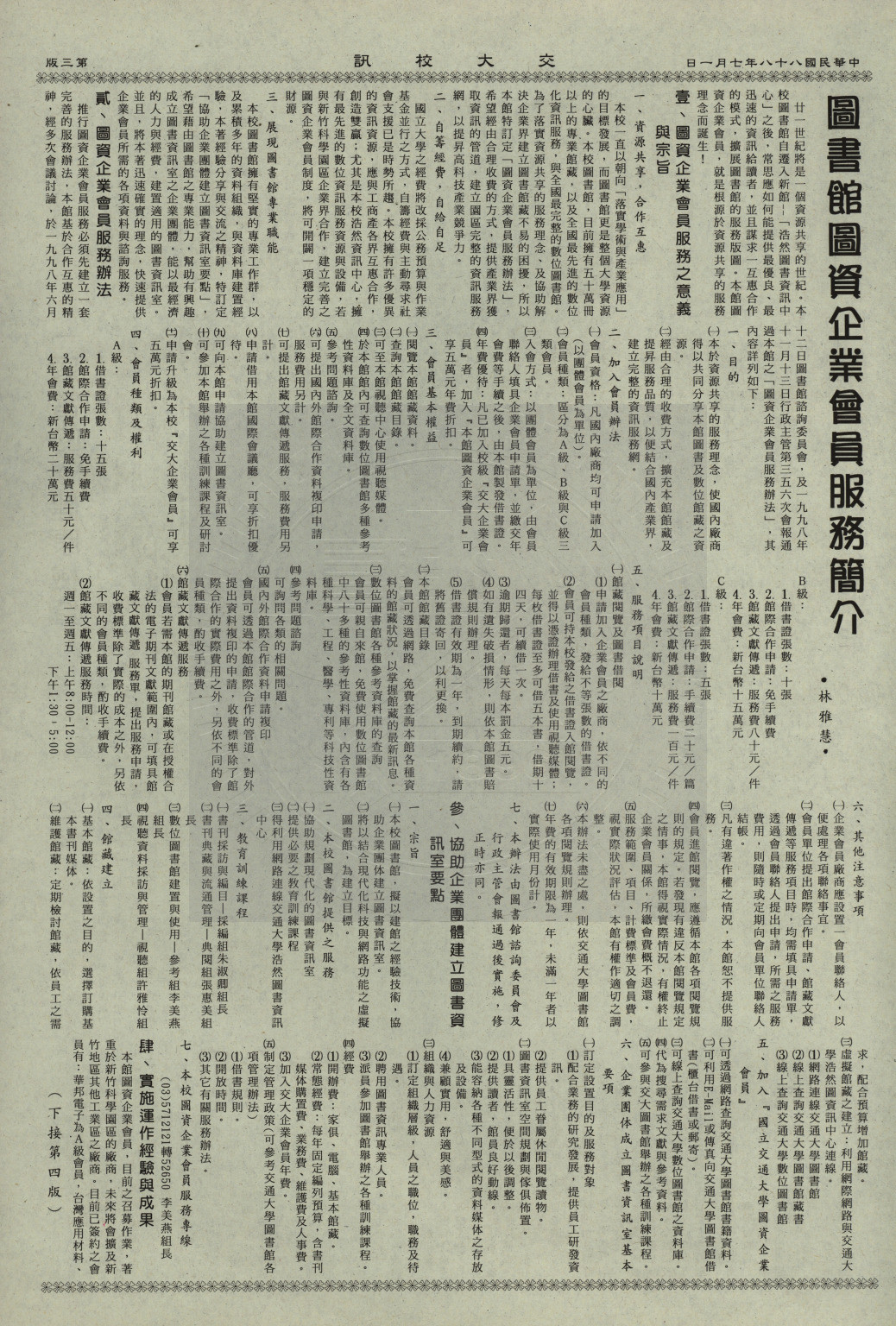 典藏地:交大校區 說明:交大校訊 第一O四期,內容含:八十七學年度名譽博士葛守仁、曹興誠先生簡介;成立楊英風藝術研究中心;圖書館圖資企業會員服務簡介等。 資料類型:書刊 典藏號:107-0008-005-104 品名:交大校訊 第一O四期 作者:國立交通大學秘書室編輯 年代:1999 出版者:國立交通大學 數量:1件 稽核資料:四版(4頁) 版本: 印刷品 作品語文: 中文 關鍵詞:交大、校訊 權利聲明:國立陽明交通大學圖書館珍藏資料,如需引用,請註明來源。 取用權:開放