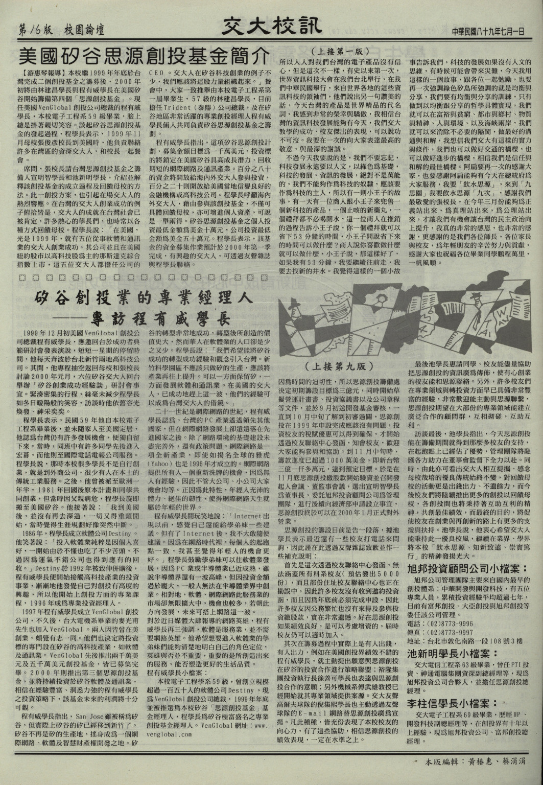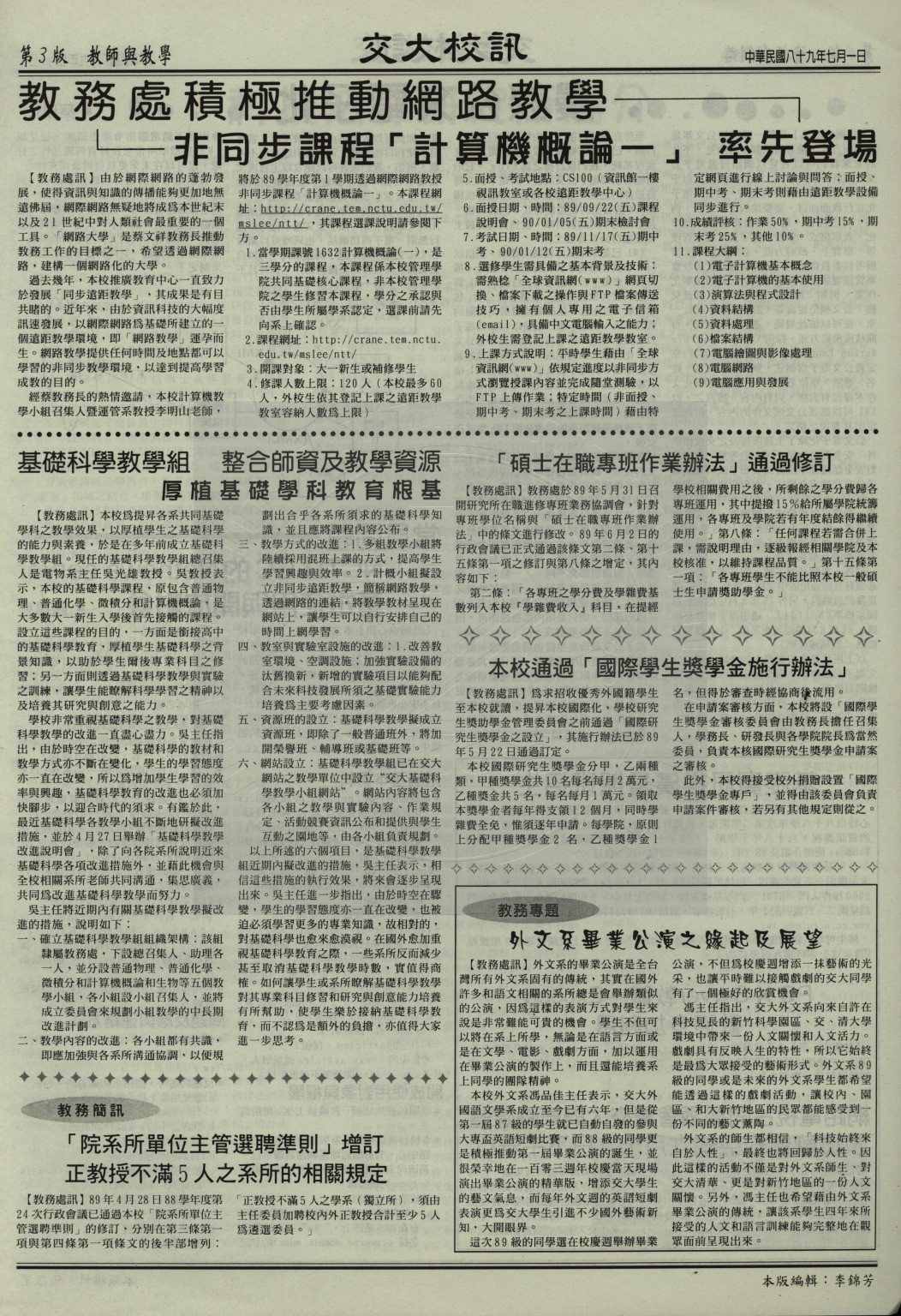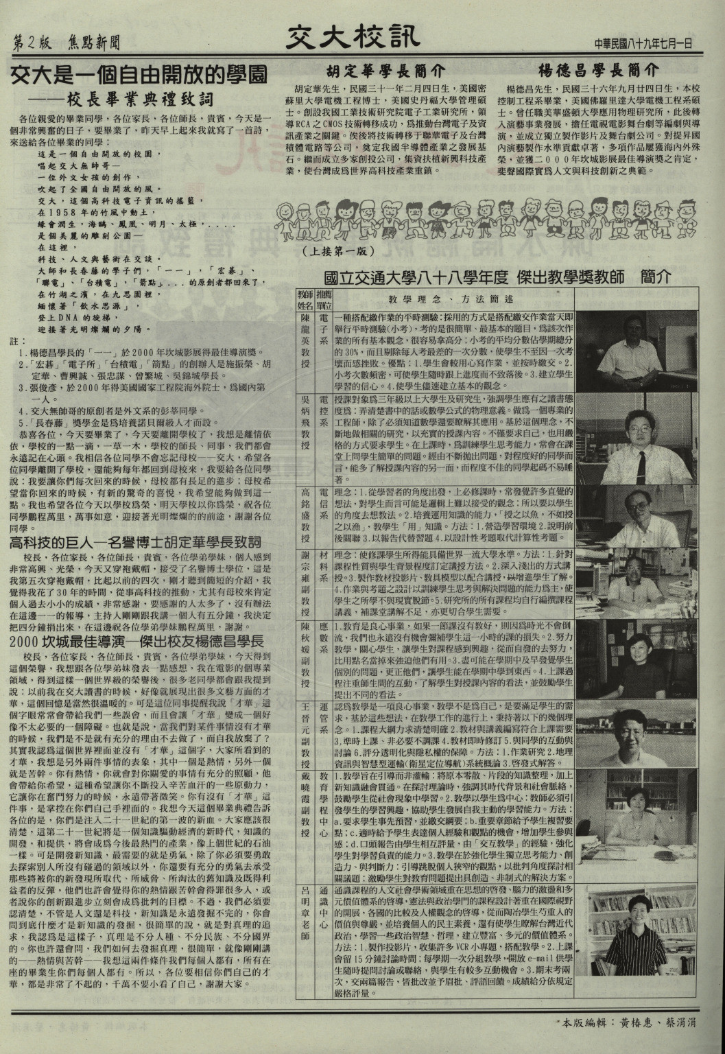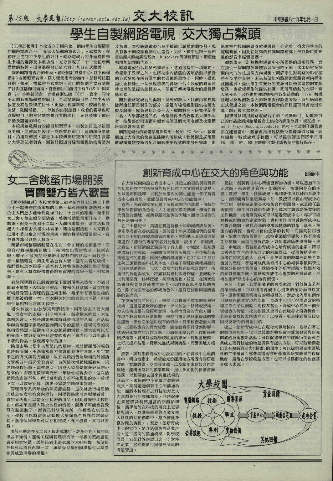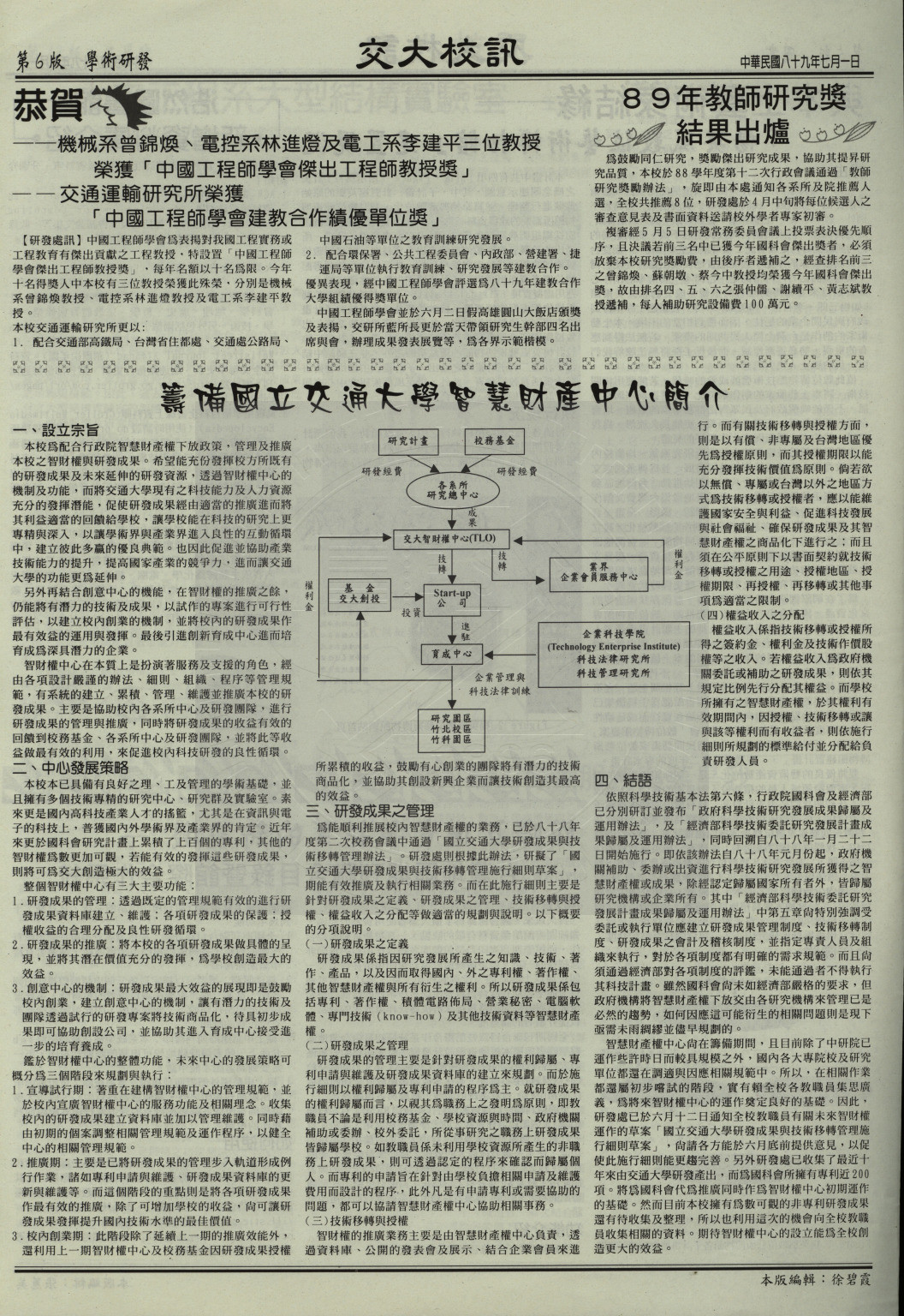 典藏地:交大校區 說明:交大校訊 第一一O期,內容含:陳水扁總統畢業典禮致詞;講座教授姚鴻澤獲麥克阿瑟獎;交大創投基金介紹;「楊英風數位藝術博物館」建置現況;籌備交通大學智慧財產中心簡介;學生自製網路電視等。 資料類型:書刊 典藏號:107-0008-005-110 品名:交大校訊 第一一O期 作者:國立交通大學秘書室編輯 年代:2000 出版者:國立交通大學 數量:1件 稽核資料:十六版(16頁) 版本: 印刷品 作品語文: 中文 關鍵詞:交大、校訊 權利聲明:國立陽明交通大學圖書館珍藏資料,如需引用,請註明來源。 取用權:開放