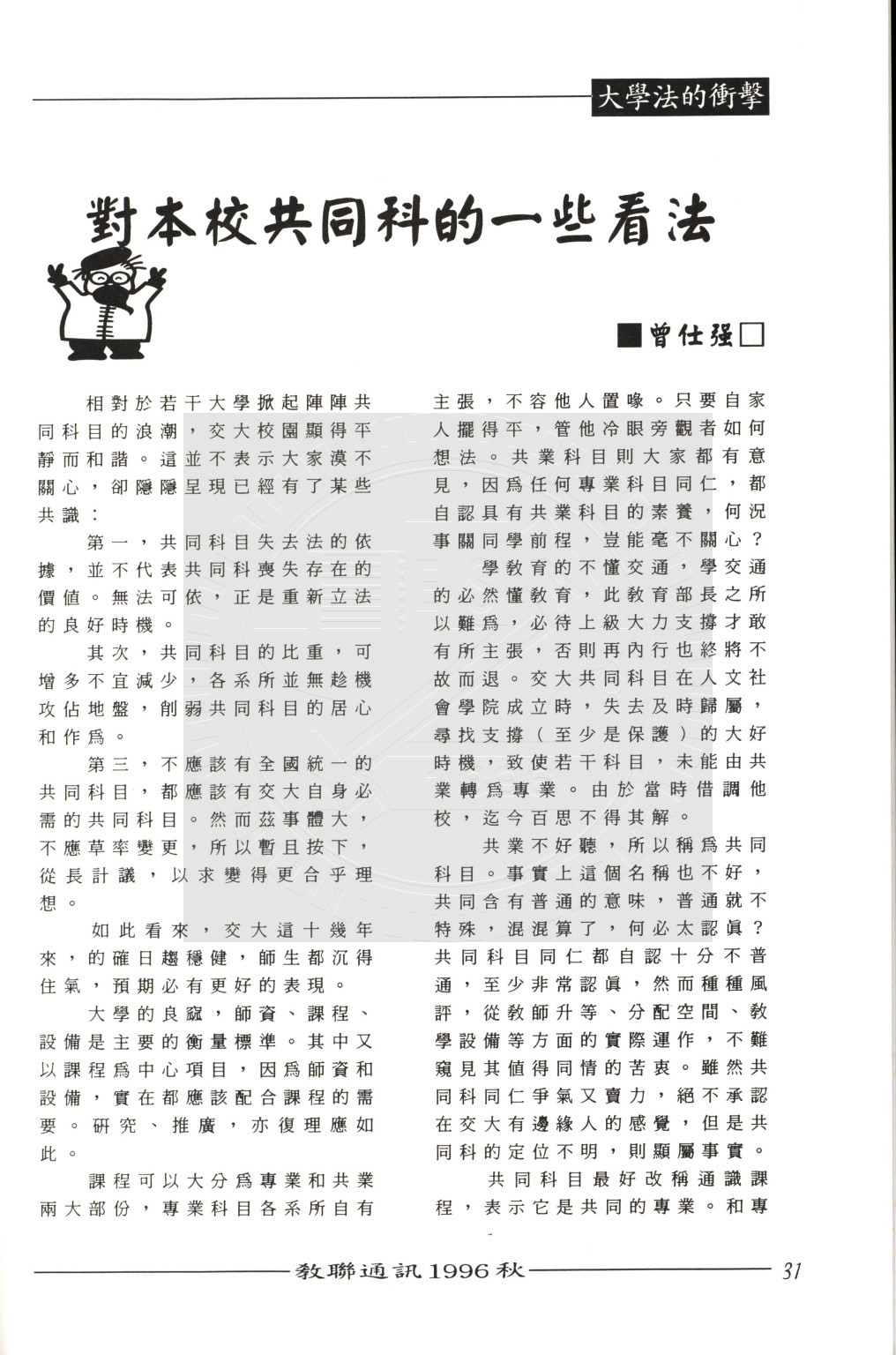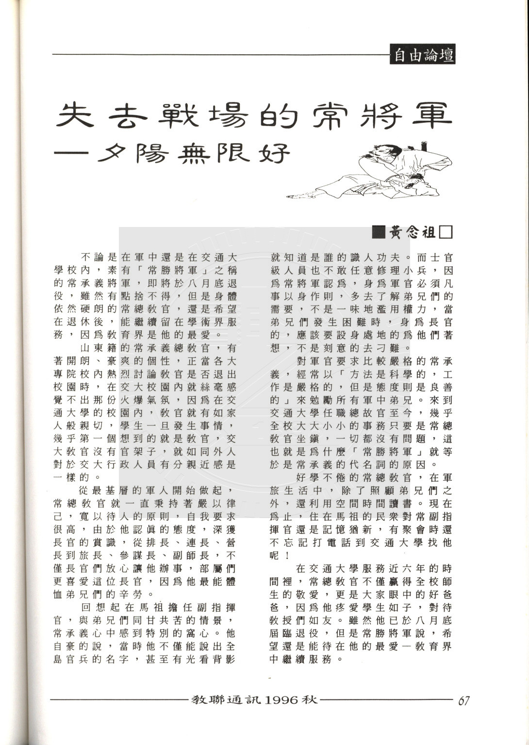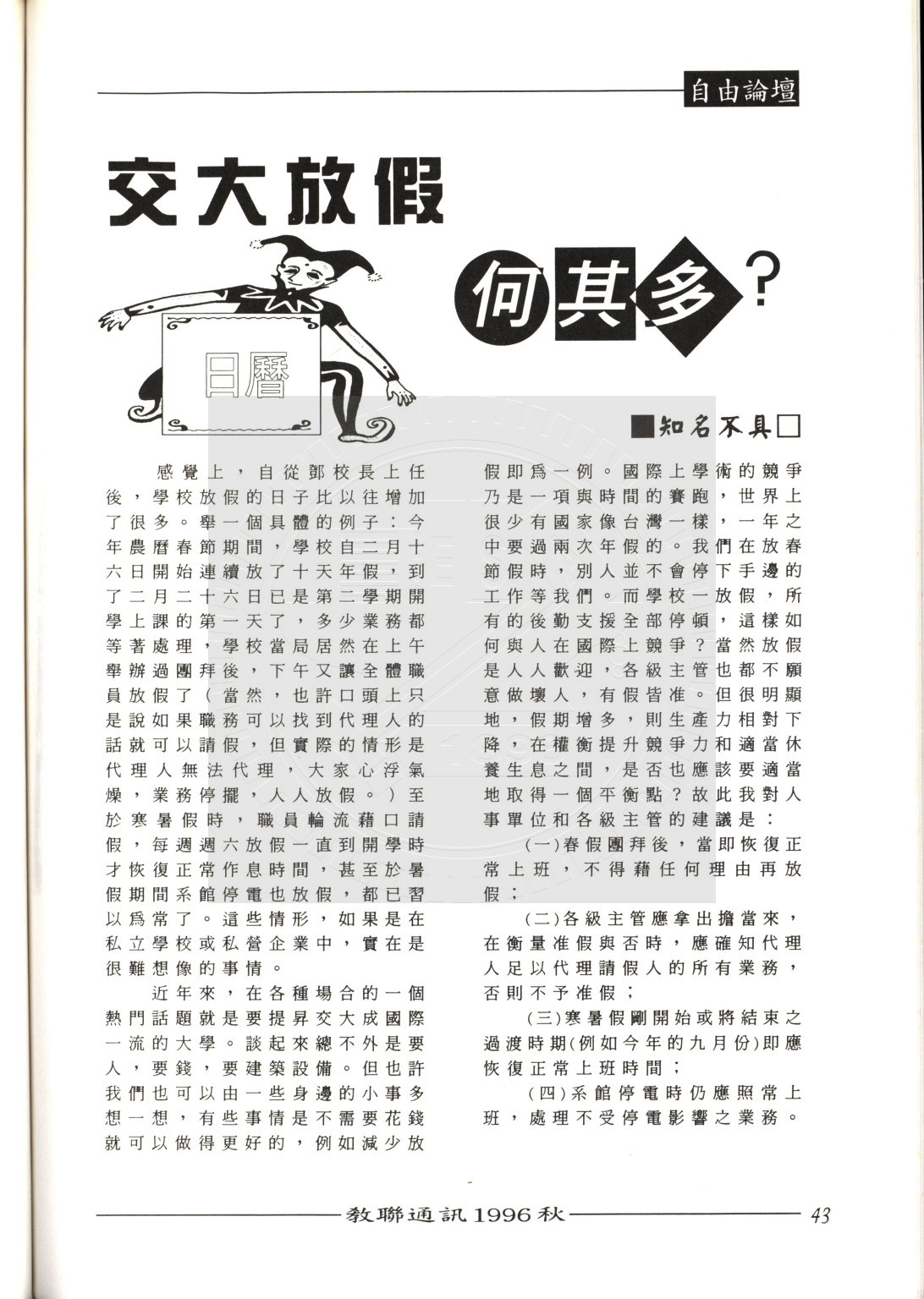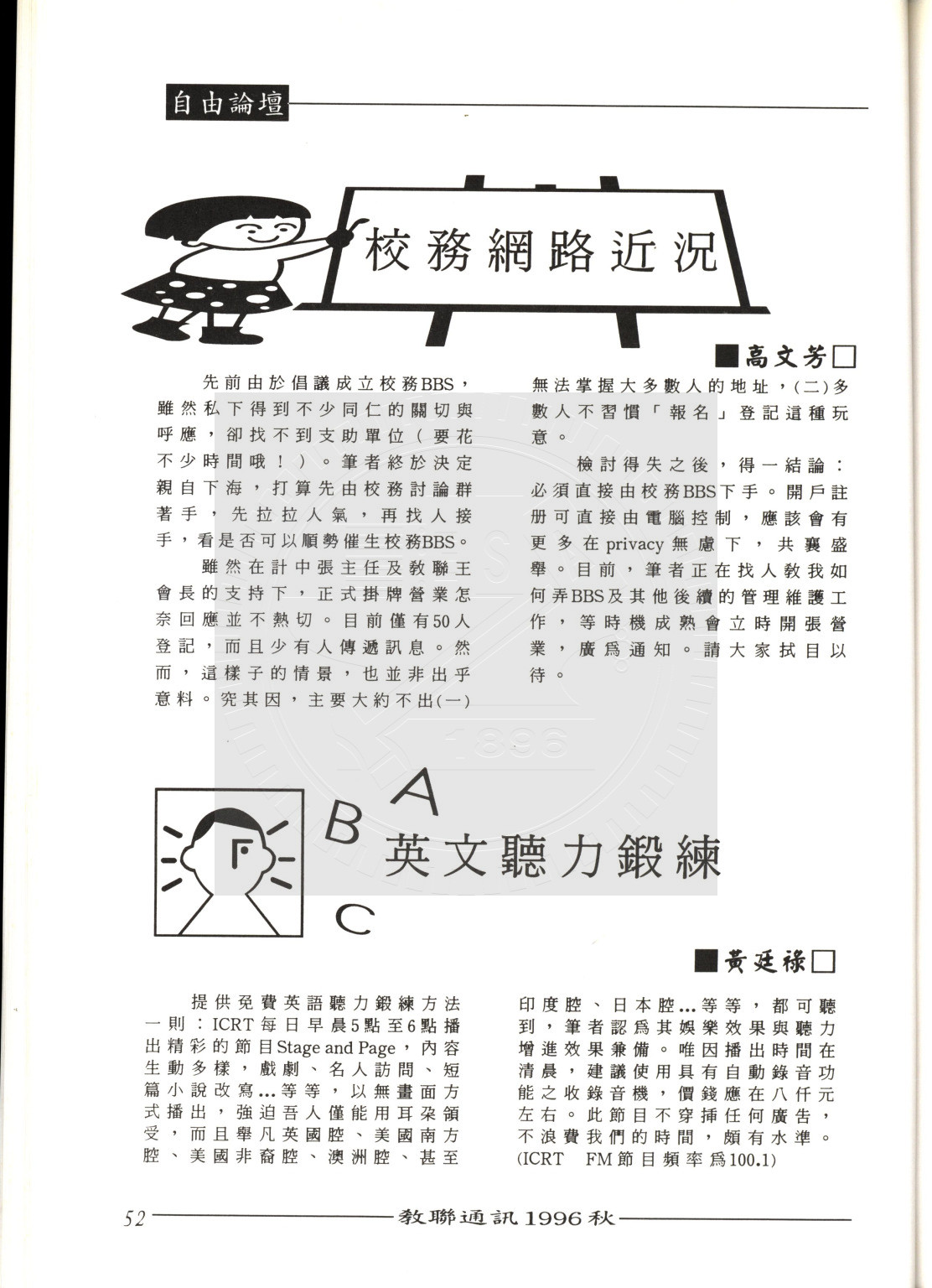 典藏地:交大校區 說明:交大教聯通訊 (85年秋季刊) 資料類型:書刊 典藏號:110-0008-002-85(1) 品名:交大教聯通訊 (85年秋季刊) 作者:- 年代:1996 出版者:國立交通大學教師聯誼會發行 數量:1冊 稽核資料:80頁 版本: 印刷品 作品語文: 中文 關鍵詞:交大、教聯通訊 權利聲明:國立陽明交通大學圖書館珍藏資料,如需引用,請註明來源。 取用權:開放