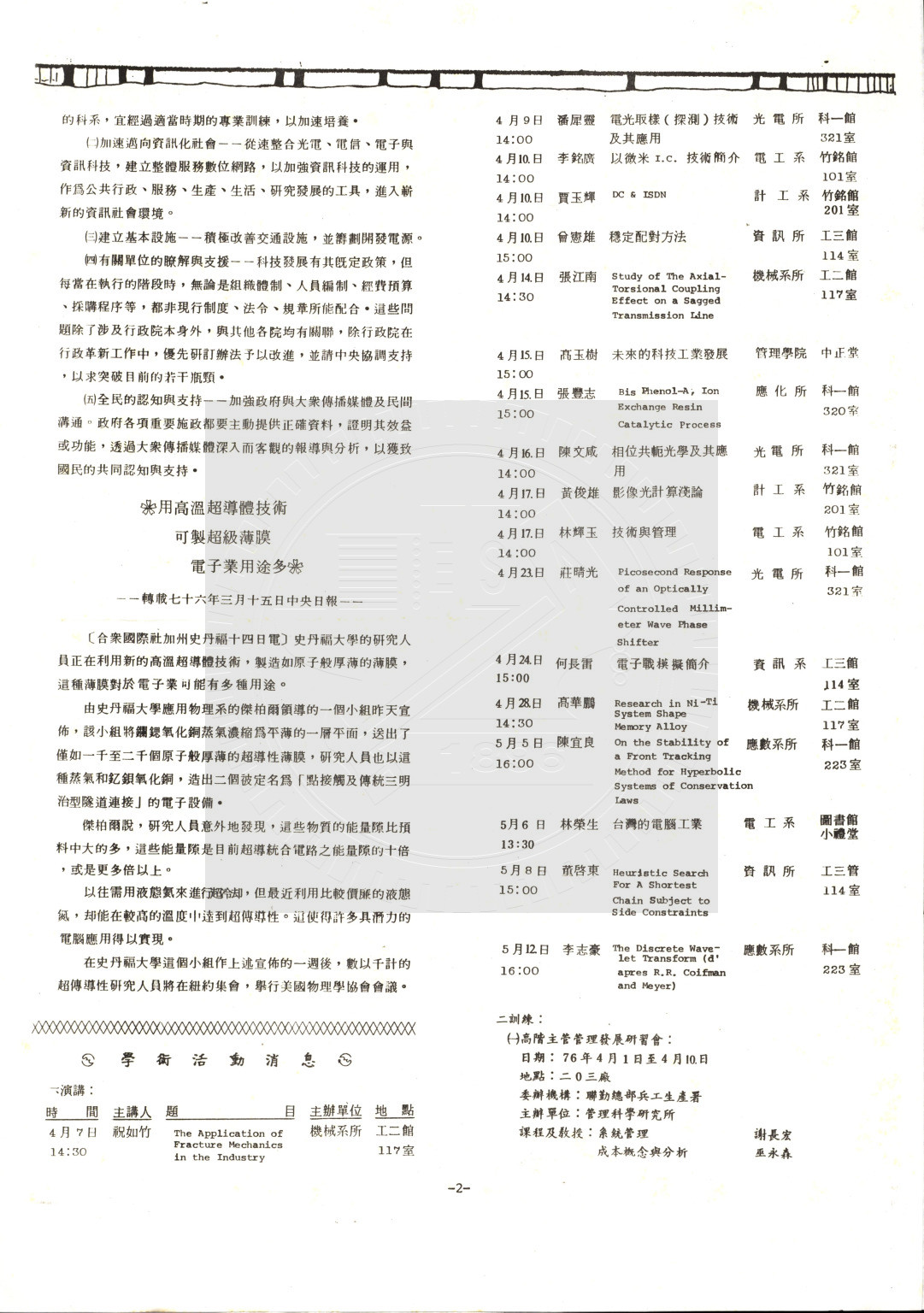 典藏地:交大校區 說明:國立交通大學科技簡訊 (76年4月)。內容:水熱法製造廉價的氧化鋯超微粒子;我國科技發展邁入第三波;用高溫超導體技術可製造超薄膜電子業用途多。 資料類型:書刊 典藏號:110-0008-004-75(9) 品名:國立交通大學科技簡訊 (76年4月) 作者:- 年代:1987 出版者:主辦單位:建教合作委員會;協辦單位:圖書館、出版組。 數量:1冊 稽核資料:3頁 版本: 印刷品 作品語文: 中文 關鍵詞:交通大學、科技簡訊 權利聲明:國立陽明交通大學圖書館珍藏資料,如需引用,請註明來源。 取用權:開放