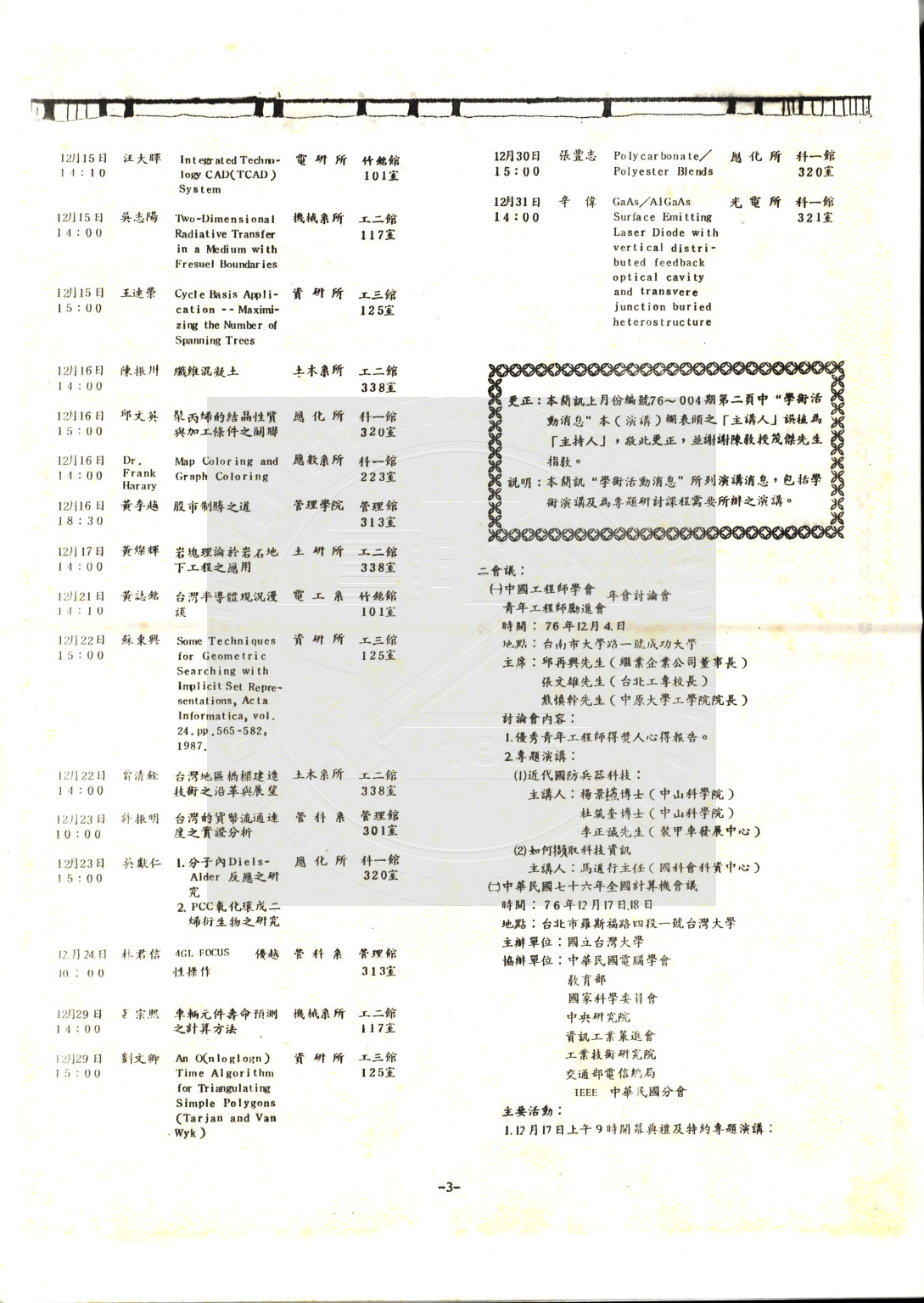 典藏地:交大校區 說明:國立交通大學科技簡訊 (76年12月)。內容:我國科技研究經費將有大幅度增加;研製鐵錳鋁合金鋼成功;廢物利用大計畫九腿青蛙打問號等。 (編按:本簡訊自七十三年八月發行以來,出版了四十期,自七十七年一月份起併入校訊,不再單獨發行)。 資料類型:書刊 典藏號:110-0008-004-76(5) 品名:國立交通大學科技簡訊 (76年12月) 作者:- 年代:1987 出版者:主辦單位:建教合作委員會;協辦單位:圖書館、出版組。 數量:1冊 稽核資料:4頁 版本: 印刷品 作品語文: 中文 關鍵詞:交通大學、科技簡訊 權利聲明:國立陽明交通大學圖書館珍藏資料,如需引用,請註明來源。 取用權:開放