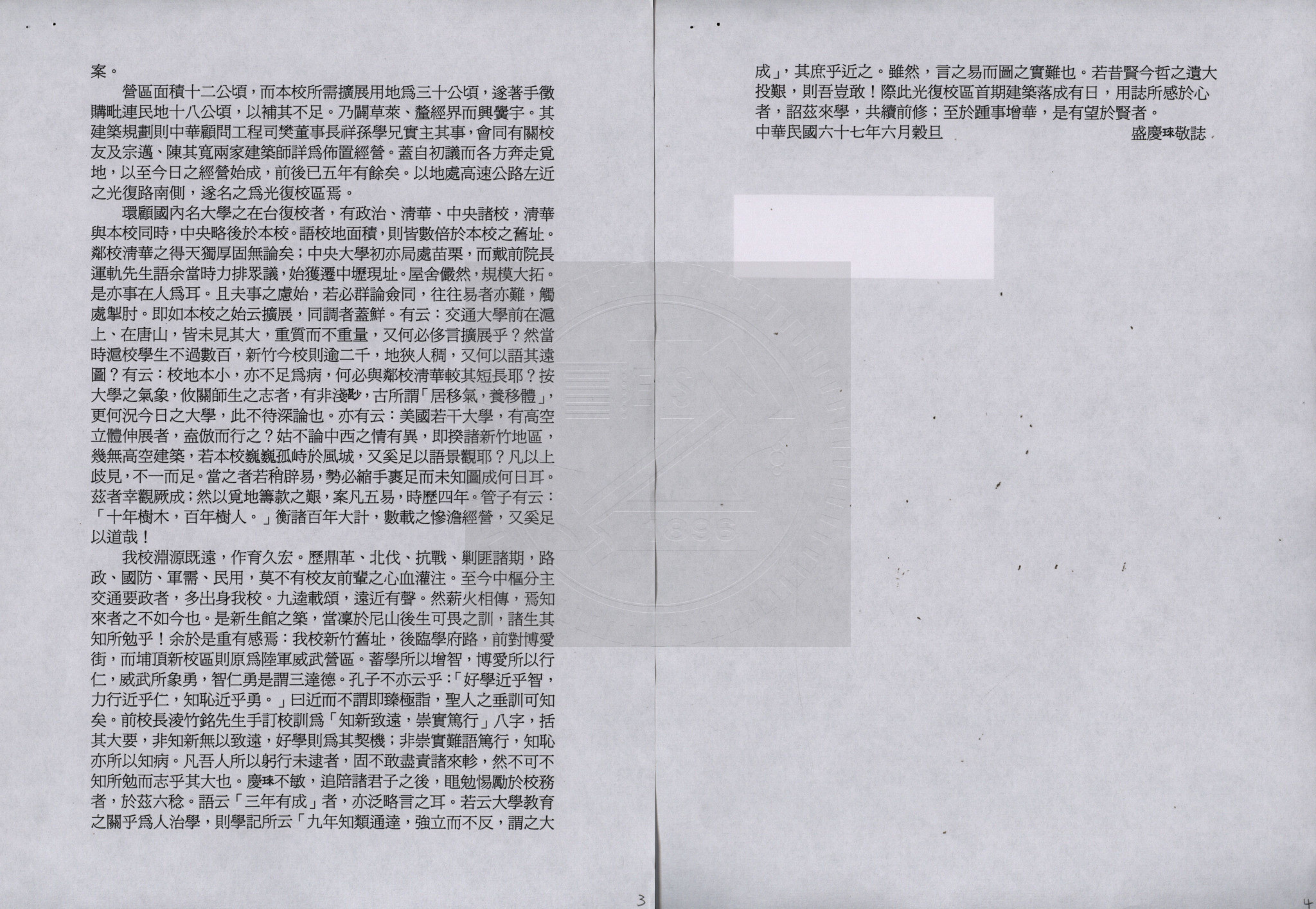 典藏地:交大校區 說明:新闢光復校區記(盛慶琜誌);鐫刻於新生館 (民67年6月)。 資料類型:文稿 典藏號:301-0004-0002-001 品名:新闢光復校區記(盛慶琜誌) 作者:盛慶琜 年代:1978 出版者:- 數量:1篇 稽核資料:3頁 版本: 影印稿 作品語文: 中文 關鍵詞:新闢光復校區、盛慶琜 權利聲明:國立陽明交通大學圖書館珍藏資料,如需引用,請註明來源。 取用權:開放