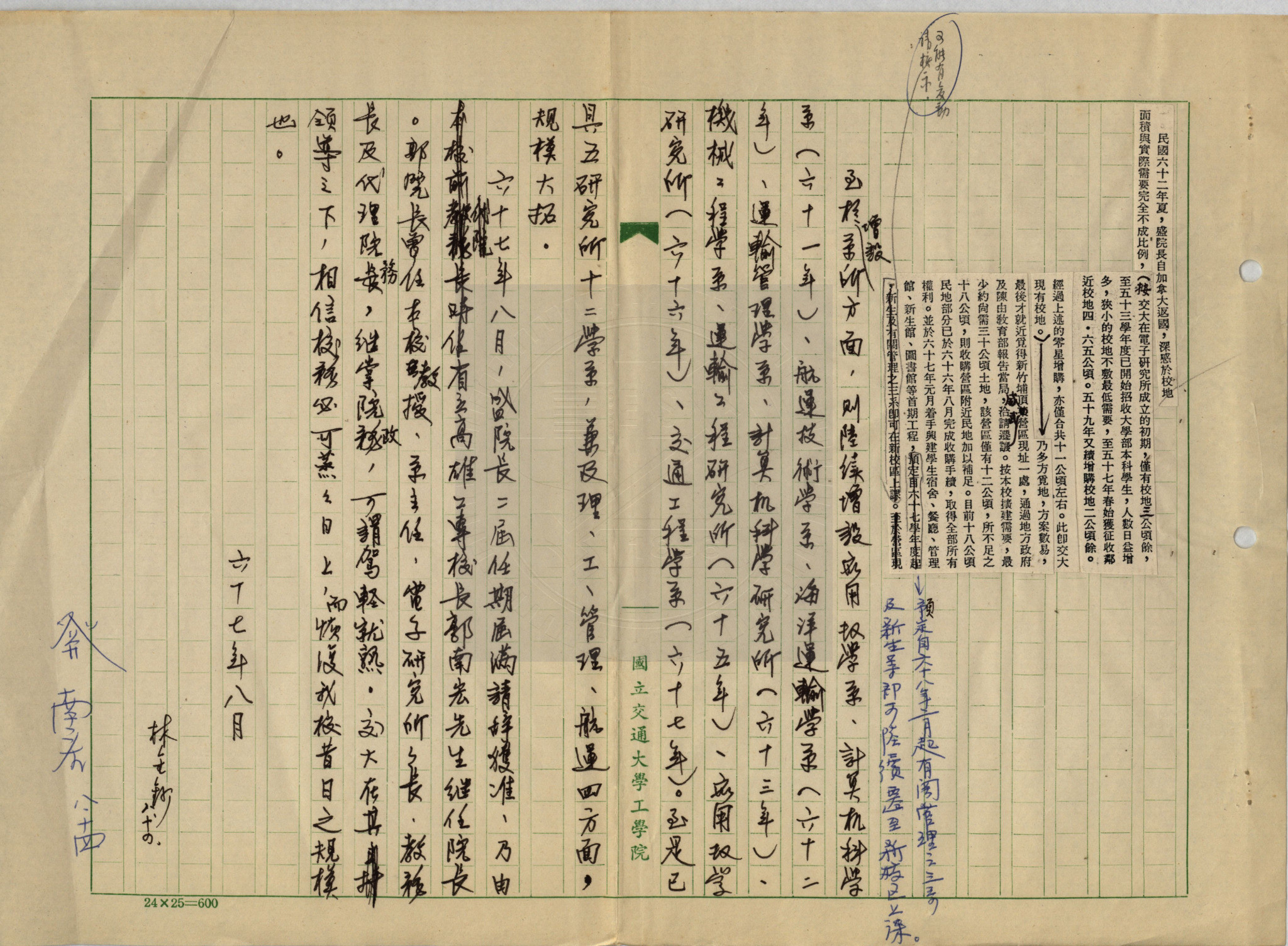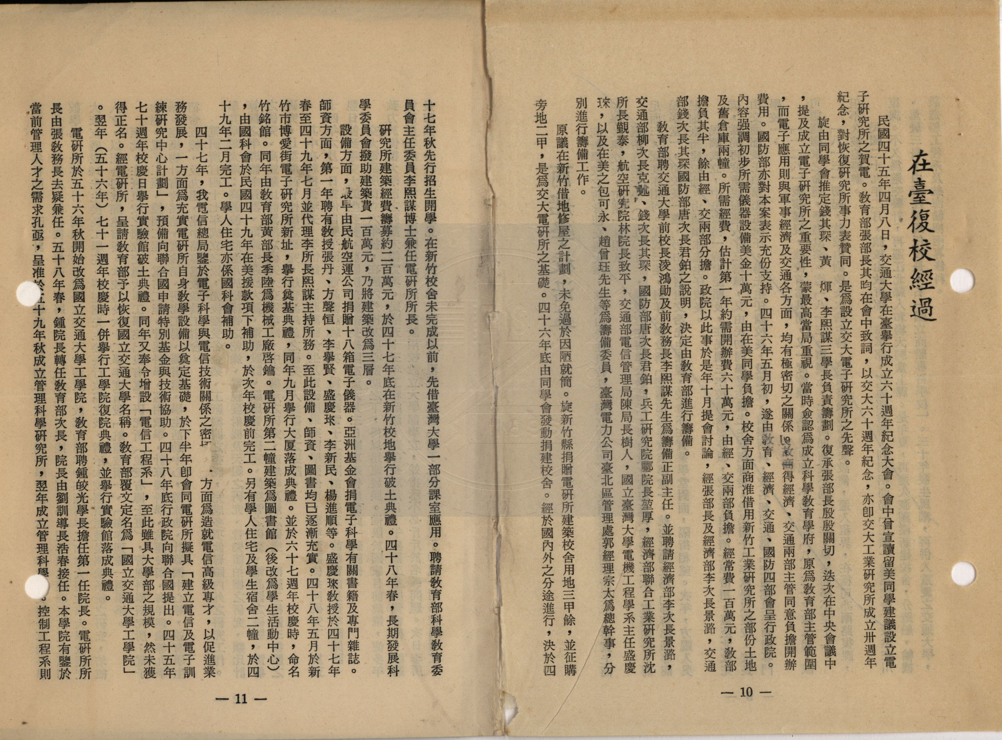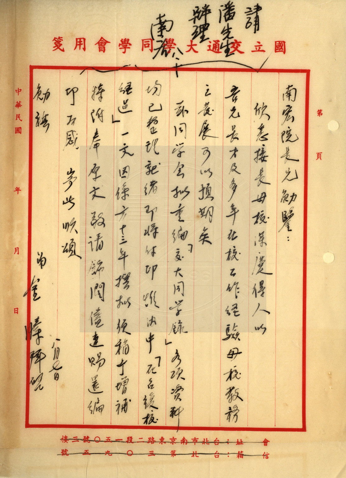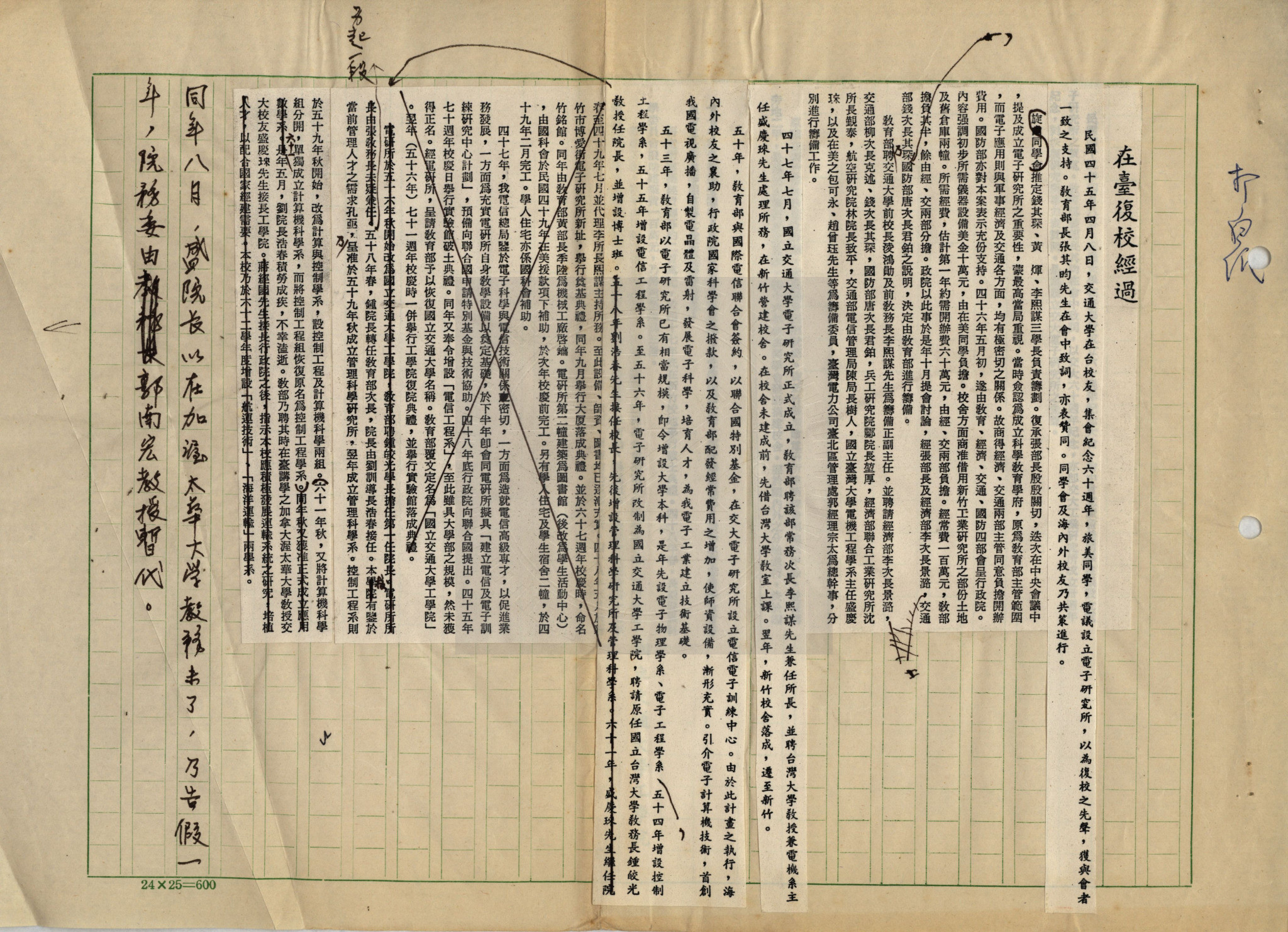 典藏地:交大校區 說明:在臺復校經過 / 郭南宏文。附:與交通部電信總局金副總局長往返信函。 資料類型:文稿 典藏號:301-0004-0002-007 品名:在臺復校經過 作者:郭南宏 年代:1978 出版者:- 數量:1篇 稽核資料:2頁 版本: 手稿 (影印稿) 作品語文: 中文 關鍵詞:在臺復校 權利聲明:國立陽明交通大學圖書館珍藏資料,如需引用,請註明來源。 取用權:開放