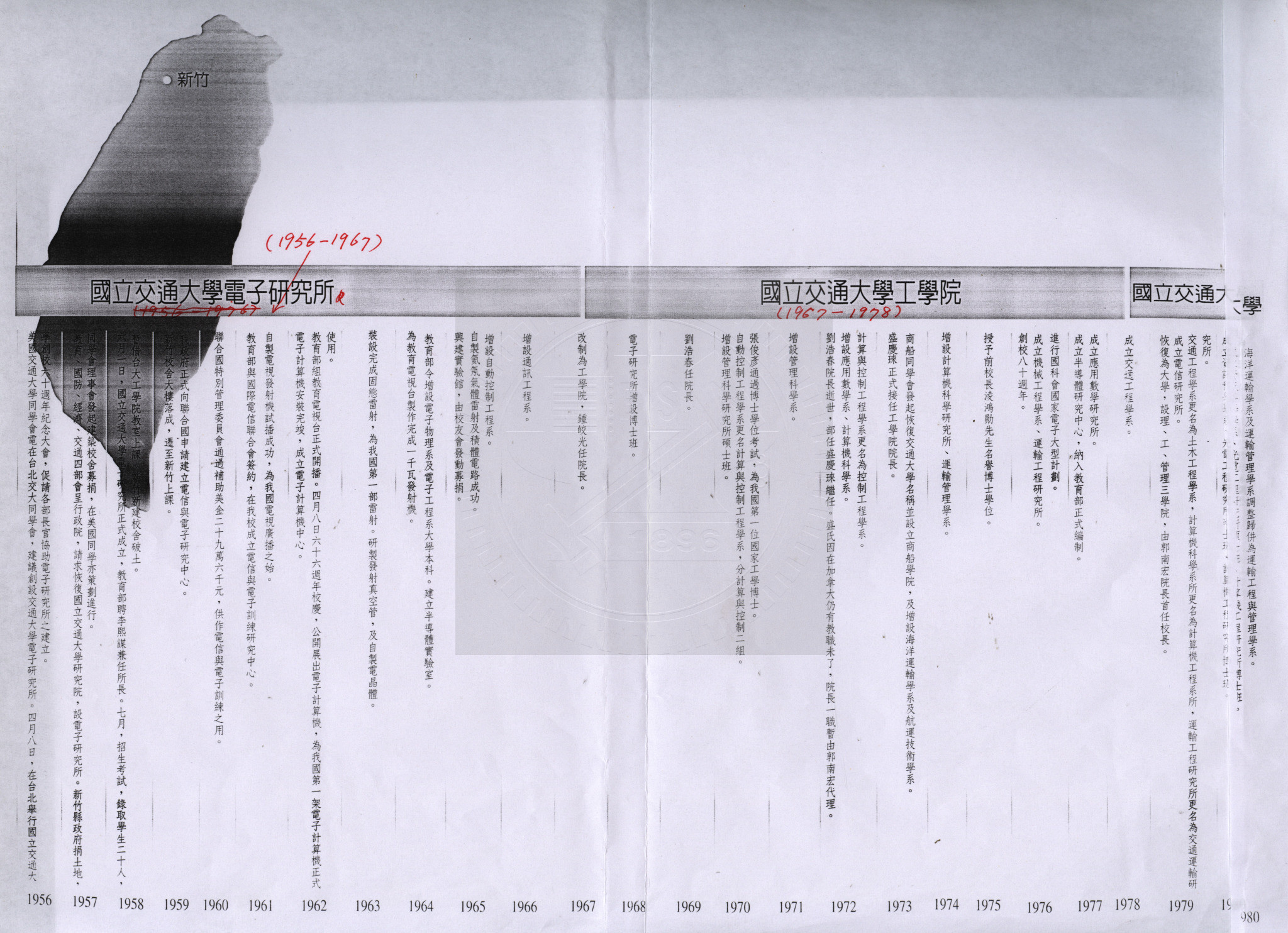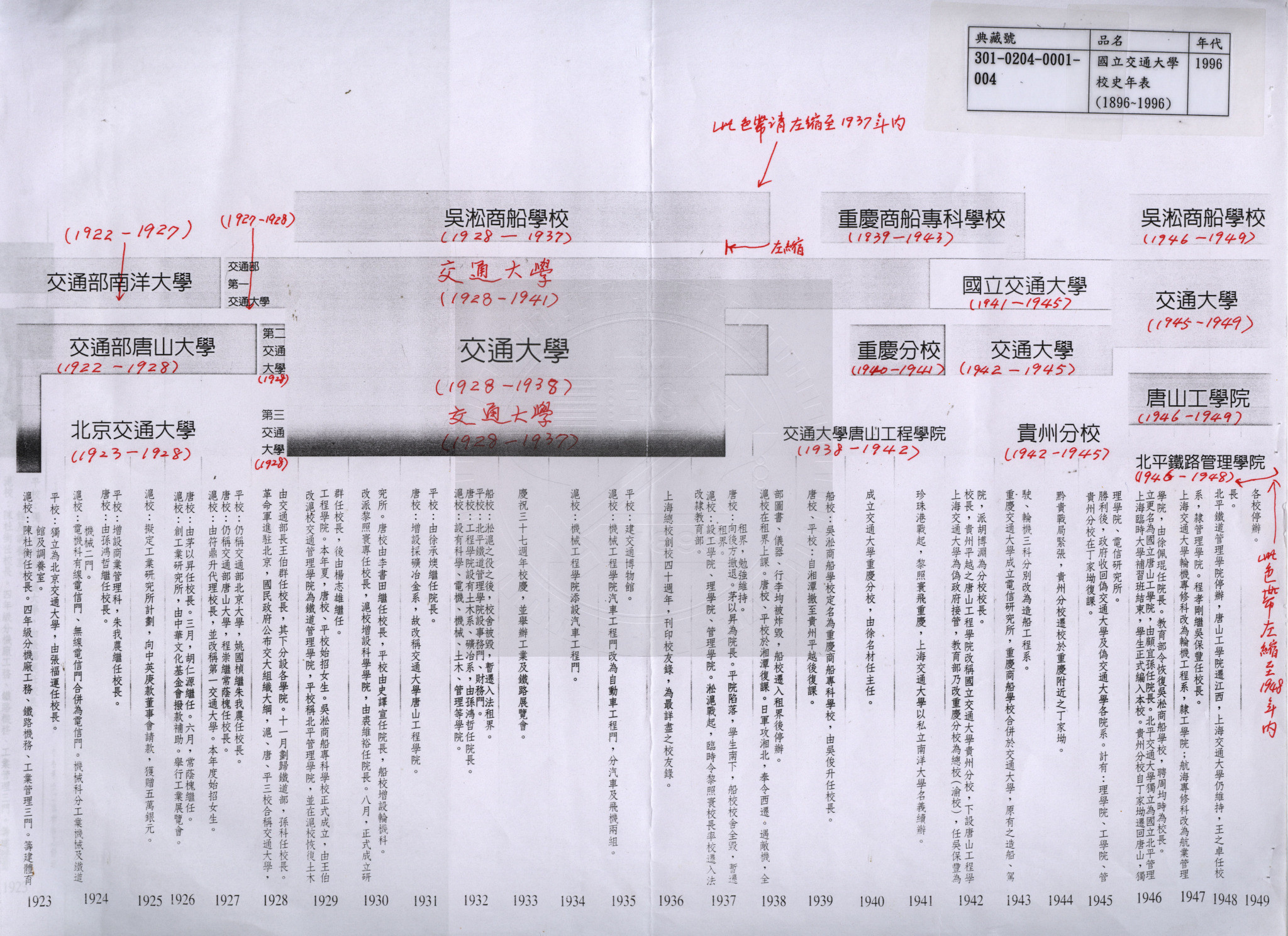 典藏地:交大校區 說明:國立交通大學校史年表 (1896~1996)。為「國立交通大學一百週年校史圖表 (1896~1996)」之修訂稿:加註年代標示。 資料類型:圖像資料 典藏號:301-0204-0001-004 品名:國立交通大學校史年表 (1896~1996) 作者:國立交通大學 年代:1996 出版者:- 數量:2大頁 稽核資料:W79 x H29 cm 版本: 影印稿 作品語文: 中文 關鍵詞:國立交通大學、校史年表 權利聲明:國立陽明交通大學圖書館珍藏資料,如需引用,請註明來源。 取用權:開放