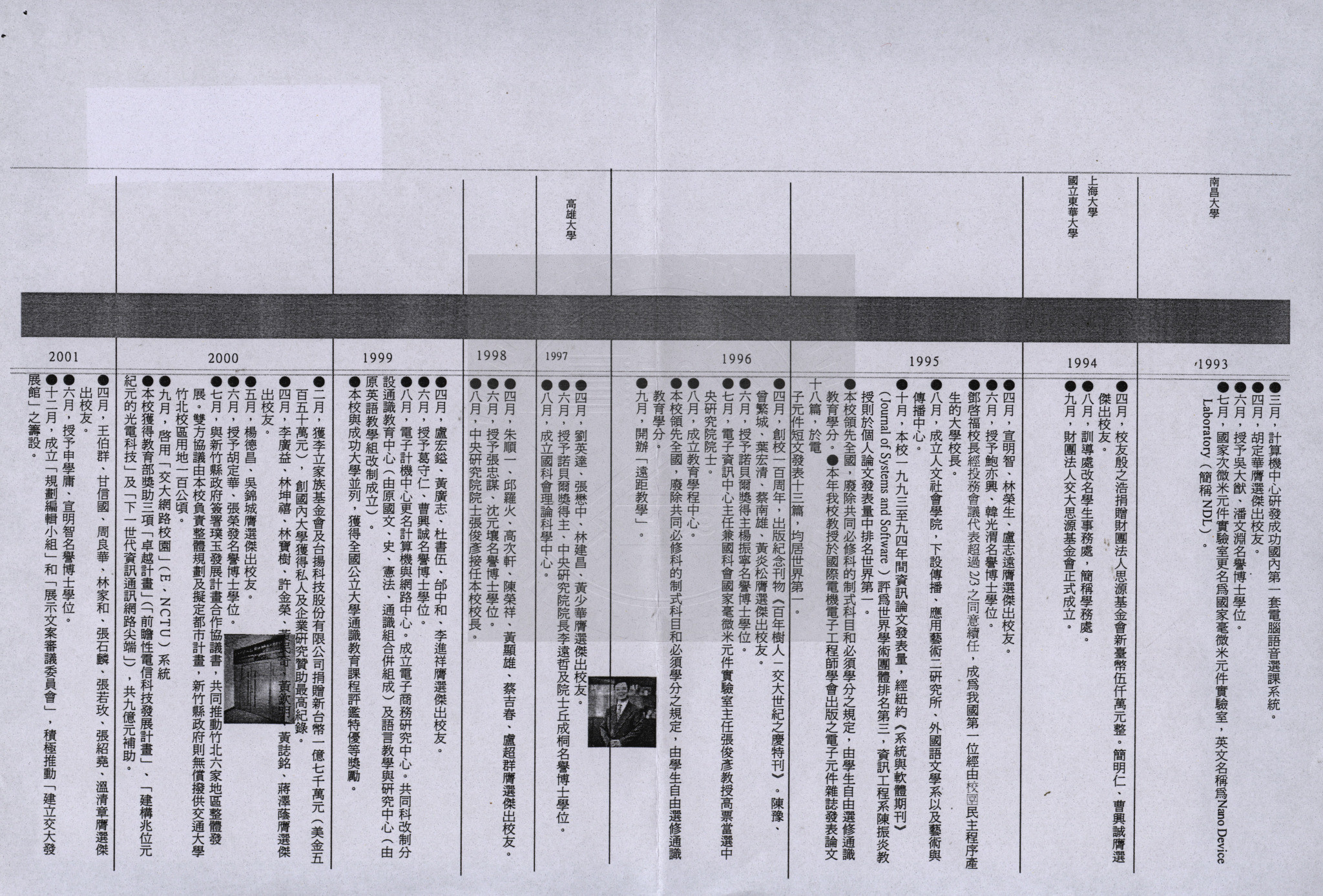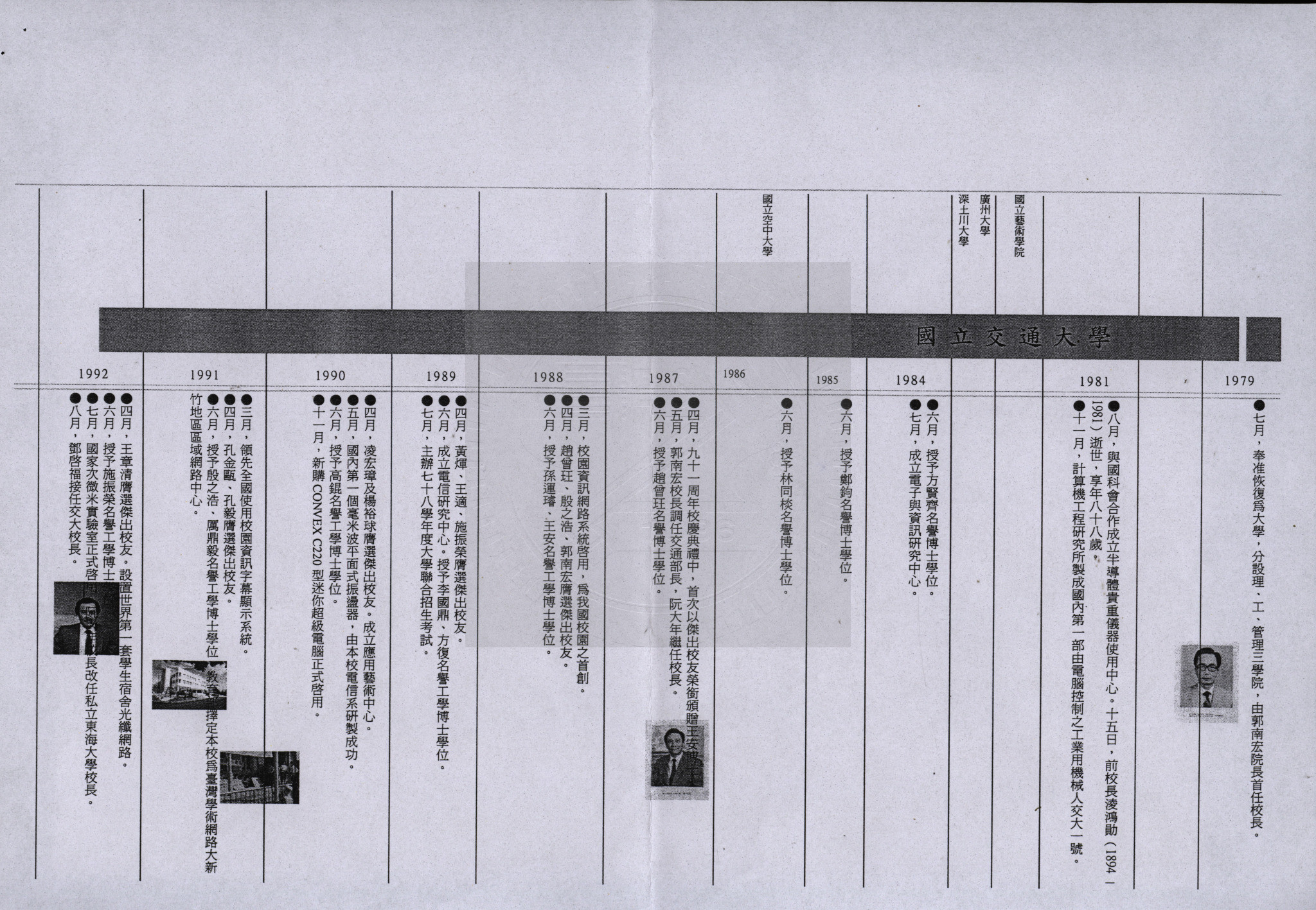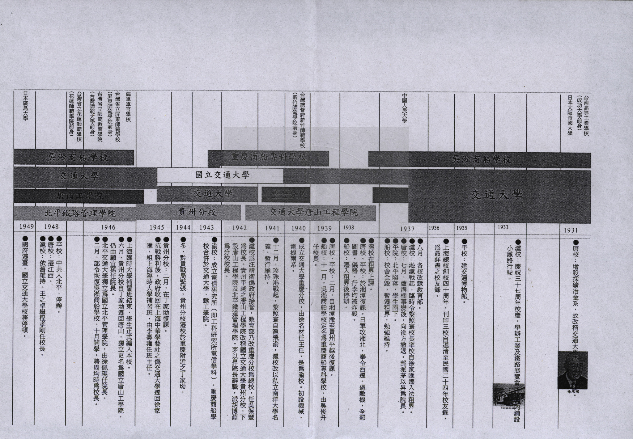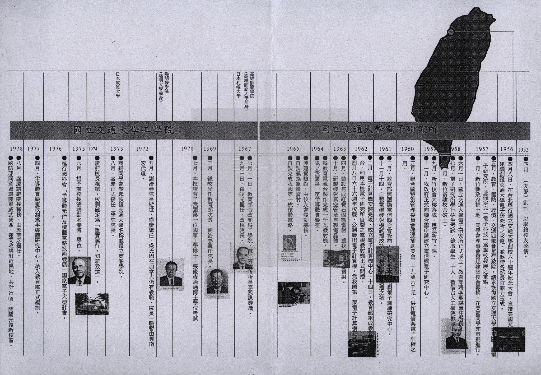 典藏地:交大校區 說明:國立交通大學校史年代表 (1896~2001) 資料類型:圖像資料 典藏號:301-0204-0001-006 品名:國立交通大學校史年代表 (1896~2001) 作者:國立交通大學 年代:2001 出版者:- 數量:1篇 稽核資料:6頁 版本: 影印稿 作品語文: 中文 關鍵詞:國立交通大學、校史年代表、校史年表 權利聲明:國立陽明交通大學圖書館珍藏資料,如需引用,請註明來源。 取用權:開放