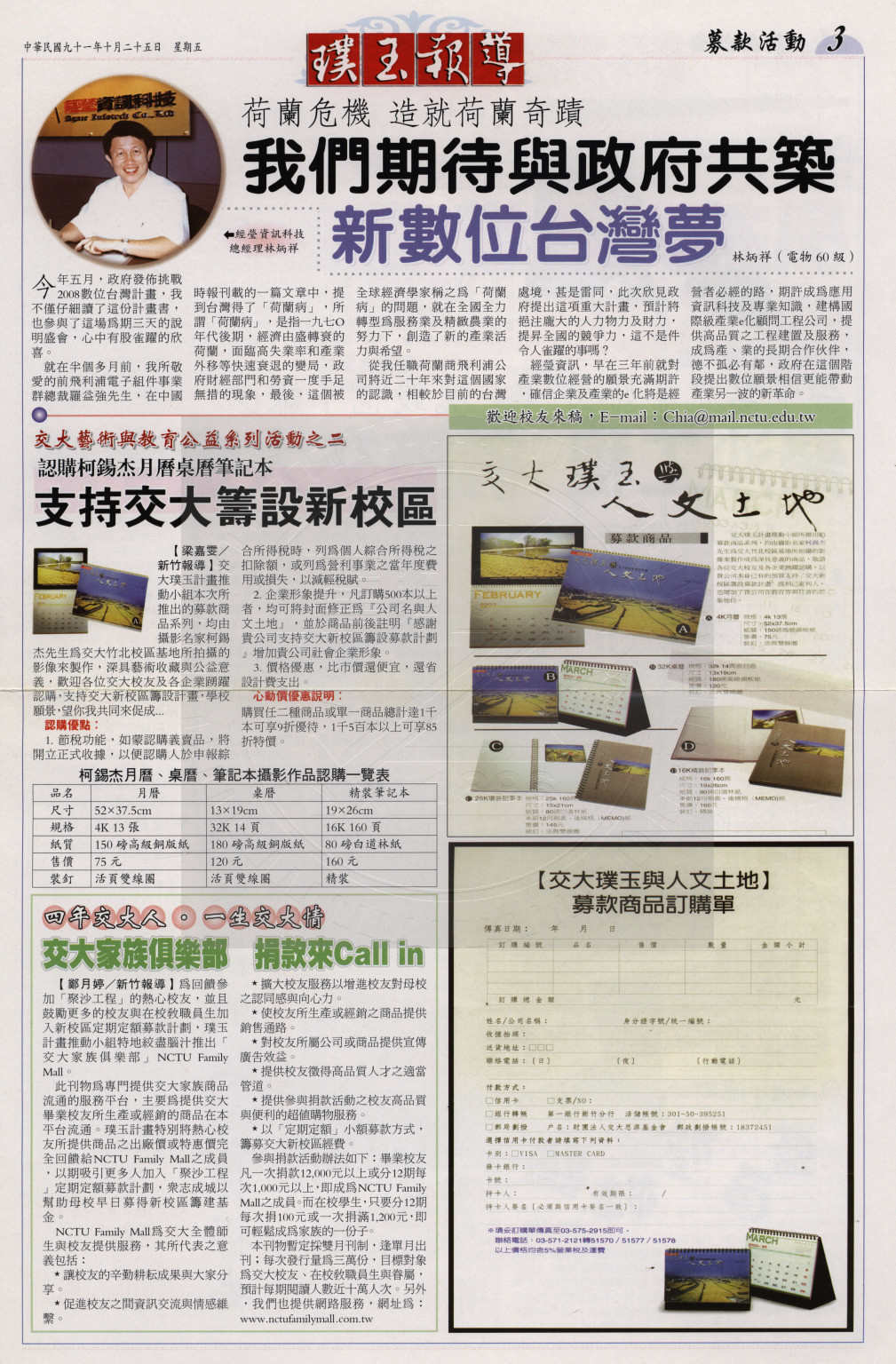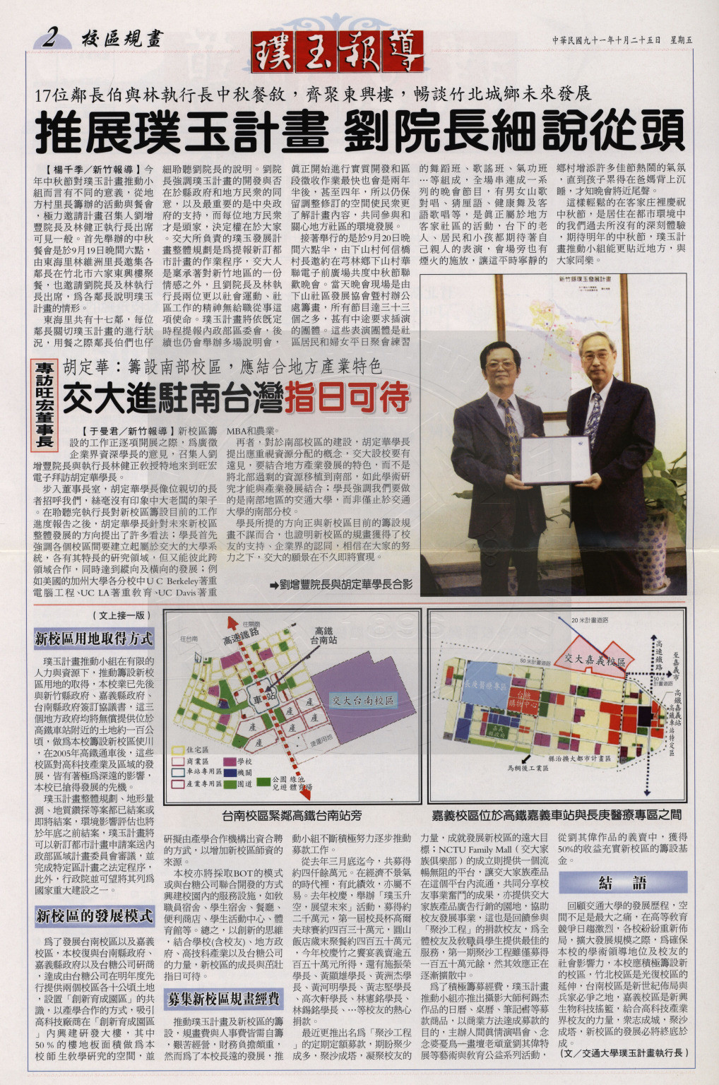 • 說明:發展新校區 世紀大佈局 (交大)。說明: 1、《璞玉報導》第三期。2、內容含交大各校區介紹、與高鐵車站的關係、新校區籌設等。