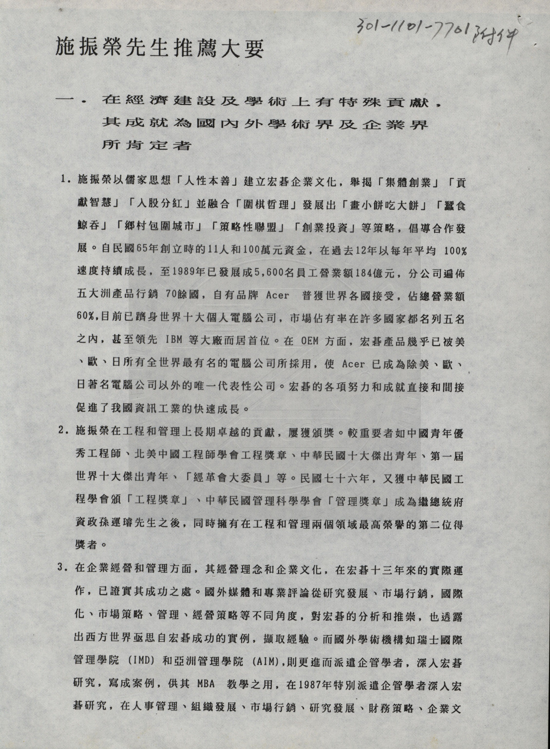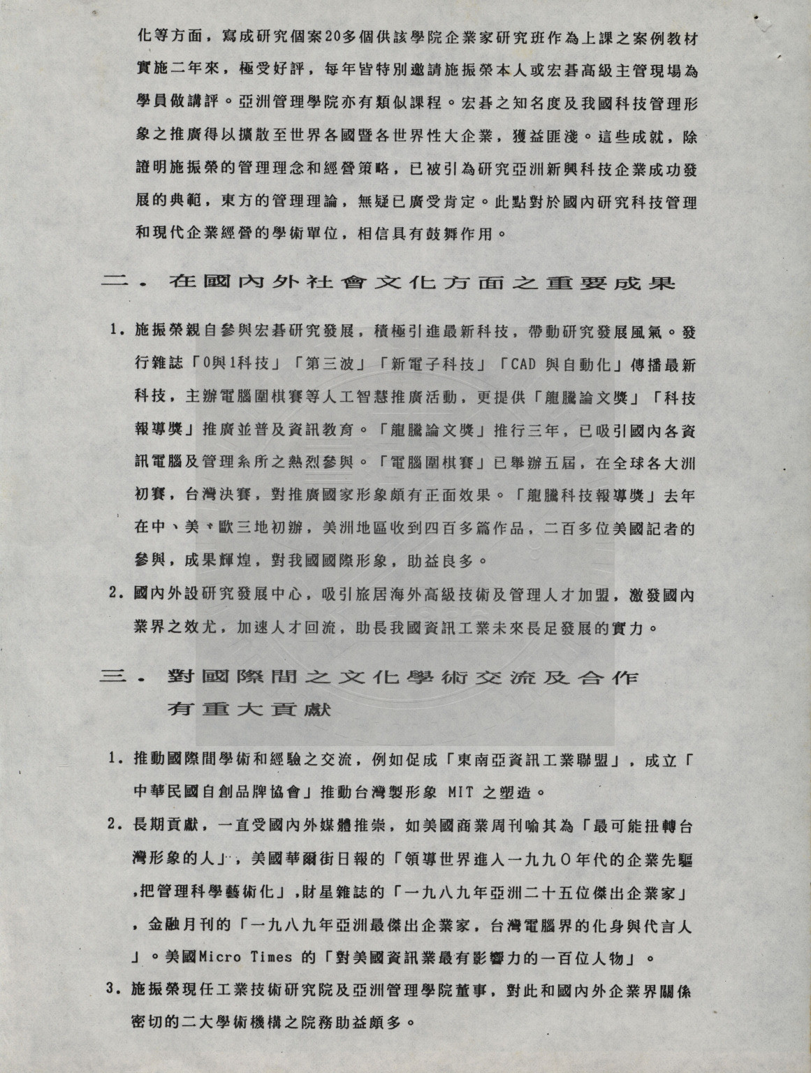 典藏地:交大校區 說明:交通大學傑出校友證書正本-施振榮先生。1、(78)交榮證字第OO三號。2、附推薦書影本乙份及施振榮先生照片一張 (W10 x H13 cm)。 資料類型:稽憑資料 典藏號:301-1101-7701 品名:交通大學傑出校友證書正本 (民國78.4.9)-施振榮先生 作者:- 年代:1989 出版者:國立交通大學 數量:1件 稽核資料:W38 x H26 cm 版本: 油印稿 作品語文: 中文 關鍵詞:交通大學、傑出校友、證書、施振榮 權利聲明:國立陽明交通大學圖書館珍藏資料,如需引用,請註明來源。 取用權:開放