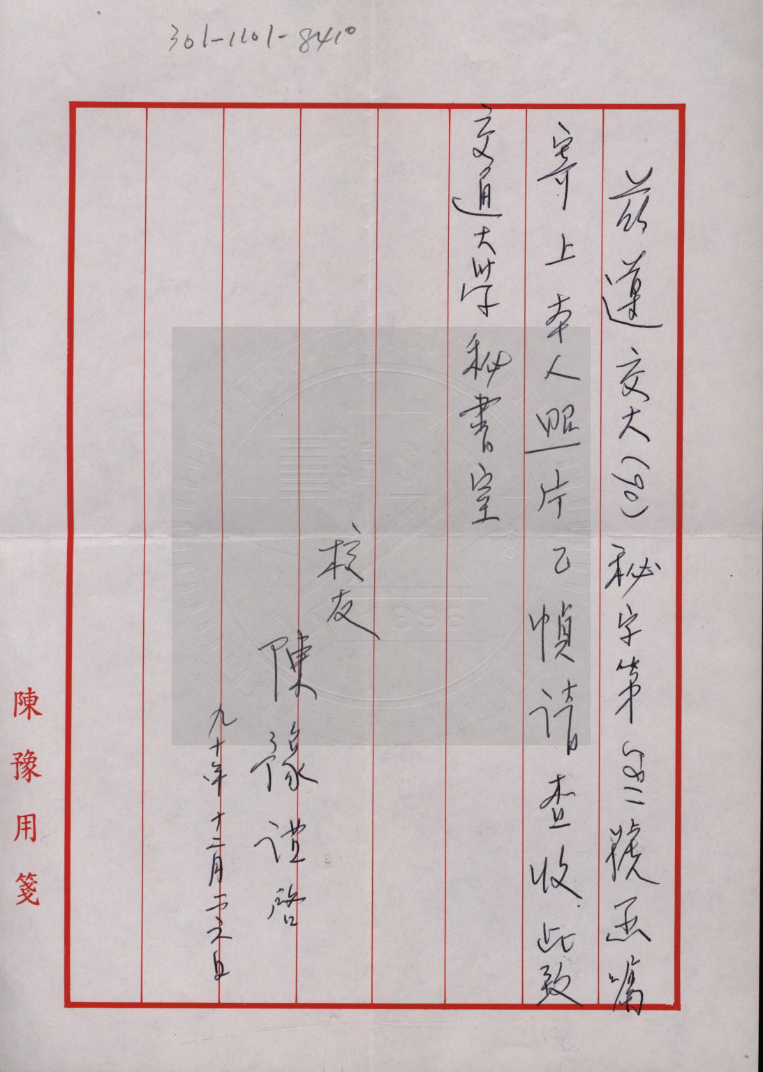 典藏地:交大校區 說明:交通大學傑出校友陳豫先生資料。 資料類型:照片 典藏號:301-1101-8410 品名:交通大學傑出校友陳豫先生資料 作者:- 年代:1995 出版者:- 數量:1件 稽核資料:W4 x H5 cm 版本: 照相複本 作品語文: - 關鍵詞:交通大學、傑出校友、陳豫 權利聲明:國立陽明交通大學圖書館珍藏資料,如需引用,請註明來源。 取用權:開放