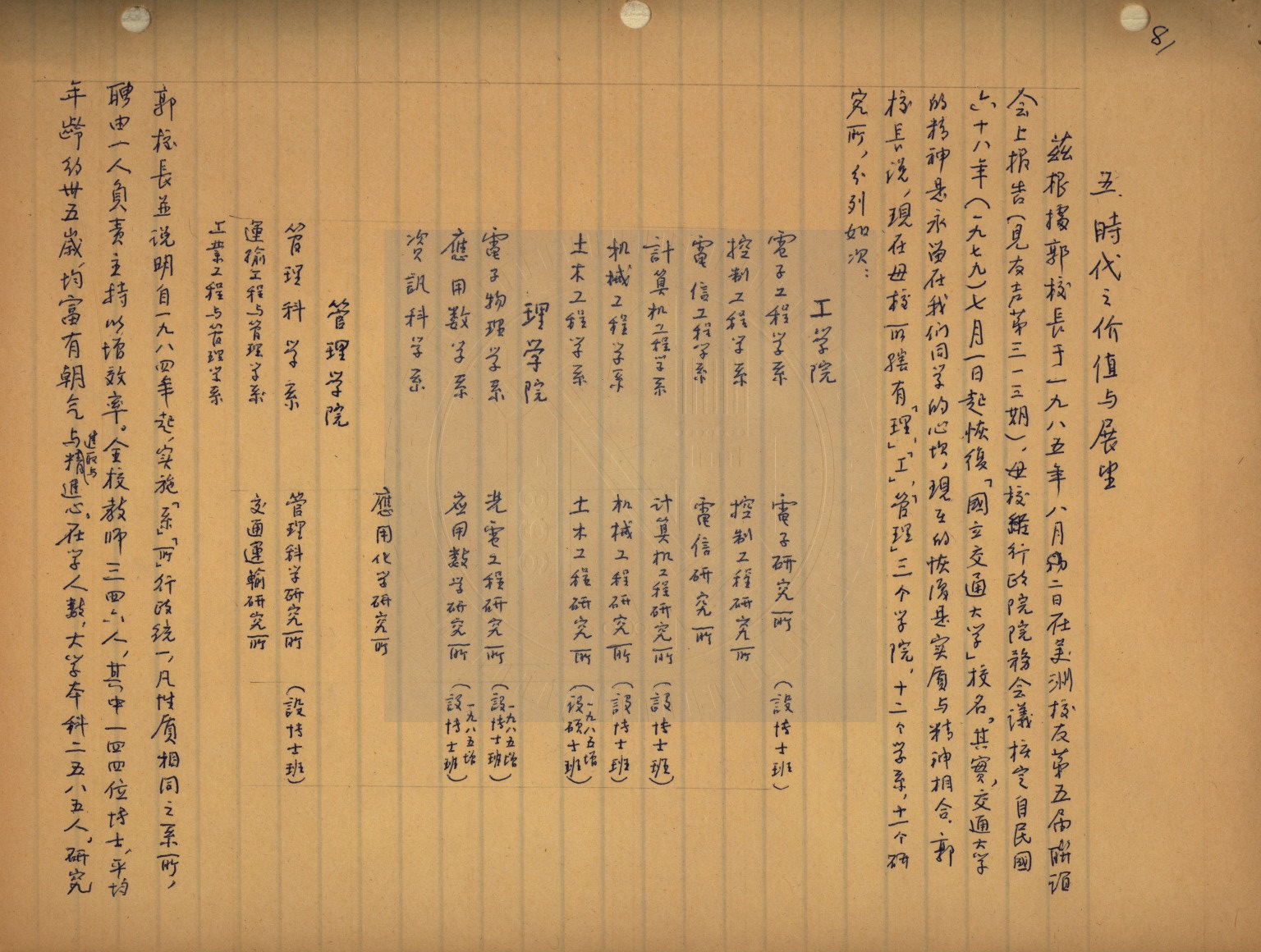典藏地:交大校區 說明:交大復校之經過及其時代之價值與展望(趙曾珏文),八六年二月二日完稿於紐約哥大。 資料類型:文稿 典藏號:301-1103-0006-018 品名:交大復校之經過及其時代之價值與展望 作者:趙曾珏 年代:1986 出版者:- 數量:1篇 稽核資料:10頁 版本: 手稿 作品語文: 中文 關鍵詞:交大、復校、價值、展望、趙曾珏 權利聲明:國立陽明交通大學圖書館珍藏資料,如需引用,請註明來源。 取用權:開放