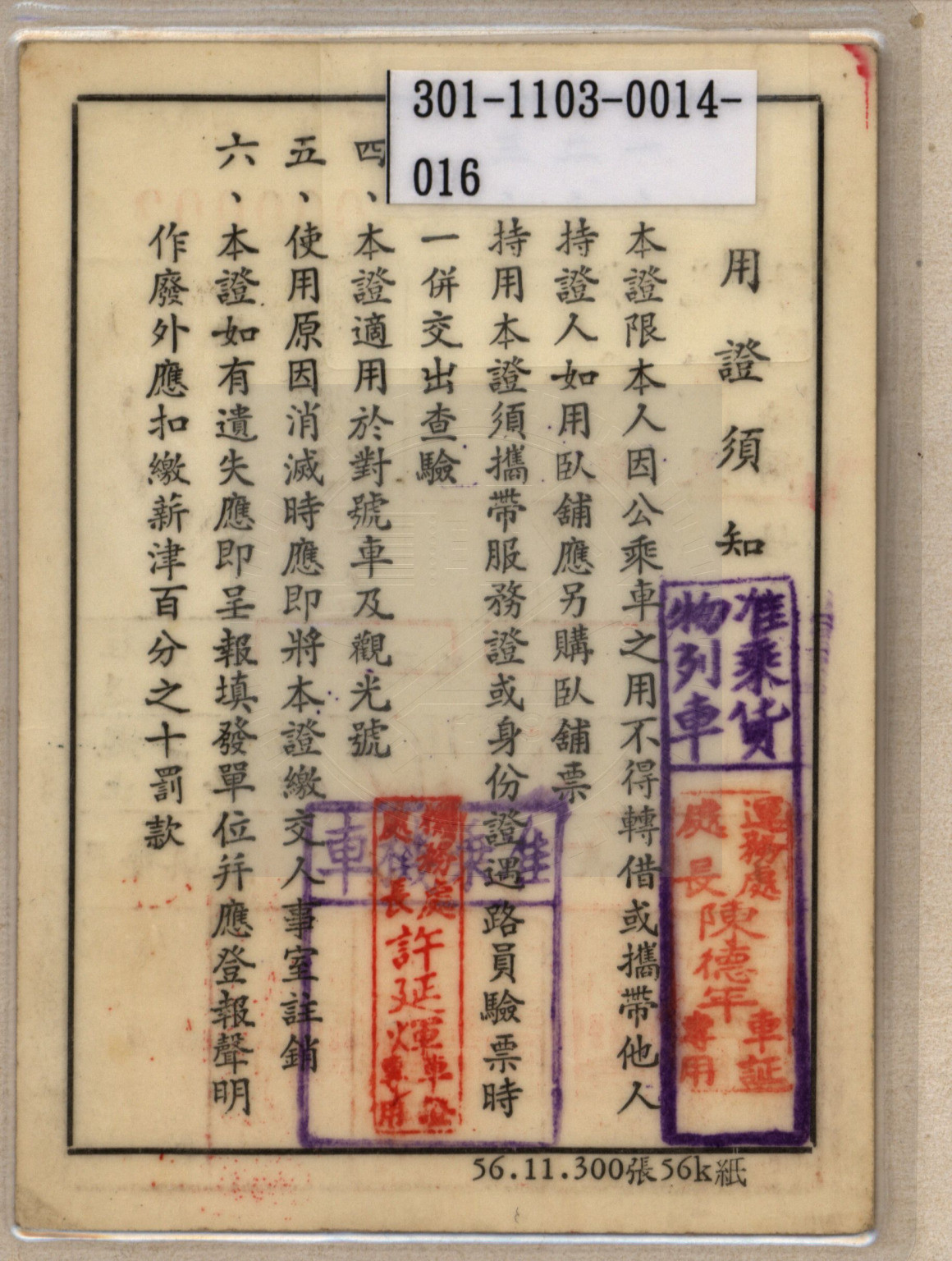 典藏地:交大校區 說明:陳樹曦學長之臺灣鐵路管理局長期公務乘車證。 資料類型:稽憑資料 典藏號:301-1103-0014-016 品名:臺灣鐵路管理局長期公務乘車證-陳樹曦 作者:- 年代:1968 出版者:台灣鐵路管理局 數量:1件 稽核資料:- 版本: 其他 作品語文: 中文 關鍵詞:台灣鐵路管理局、公務乘車證、陳樹曦 權利聲明:國立陽明交通大學圖書館珍藏資料,如需引用,請註明來源。 取用權:開放