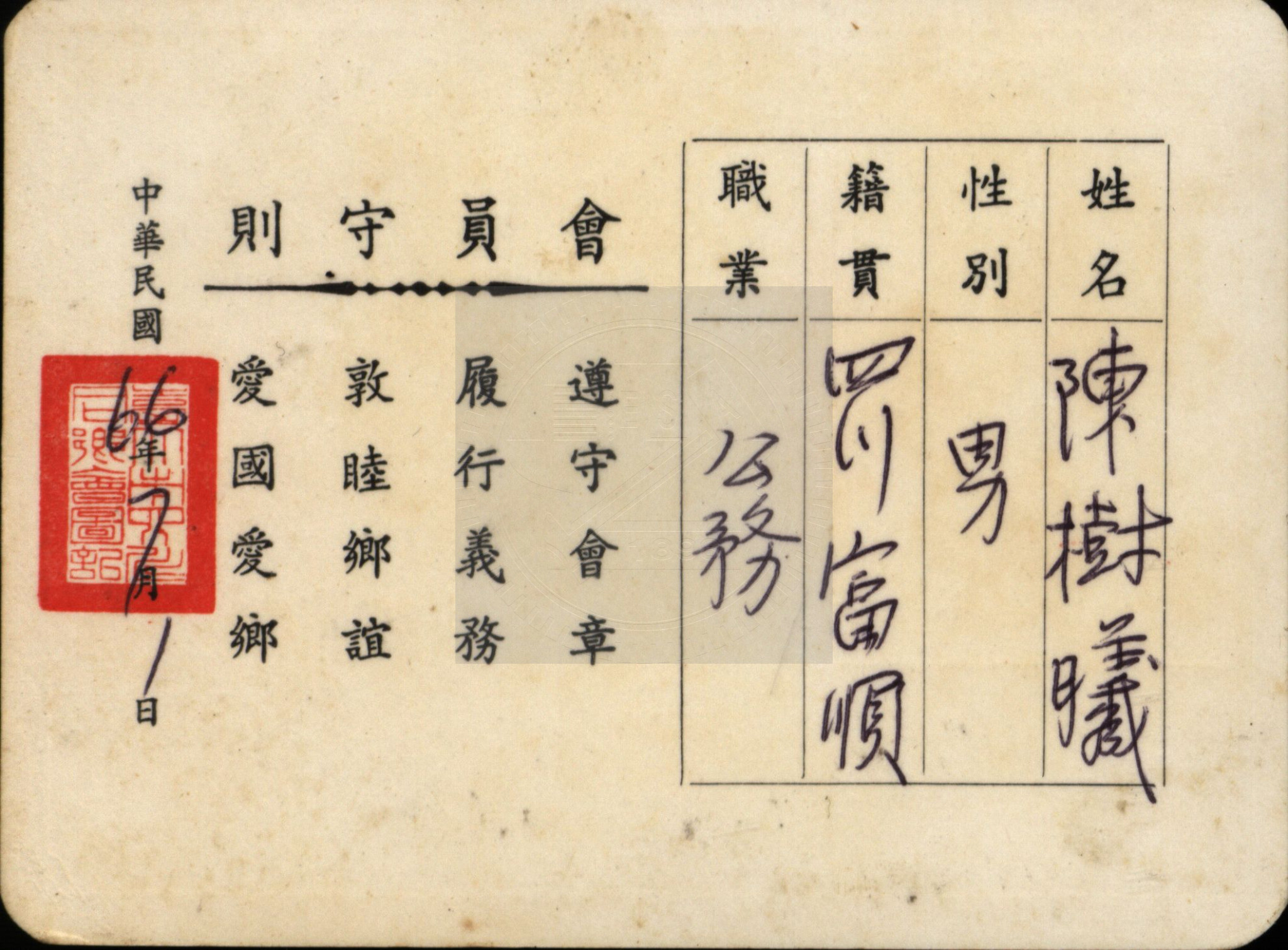 典藏地:交大校區 說明:陳樹曦學長之臺北市四川同鄉會會員證。 資料類型:稽憑資料 典藏號:301-1103-0014-024 品名:臺北市四川同鄉會會員證-陳樹曦 作者:- 年代:1977 出版者:臺北市四川同鄉會 數量:1件 稽核資料:- 版本: 其他 作品語文: 中文 關鍵詞:臺北市四川同鄉會、會員證、陳樹曦 權利聲明:國立陽明交通大學圖書館珍藏資料,如需引用,請註明來源。 取用權:開放