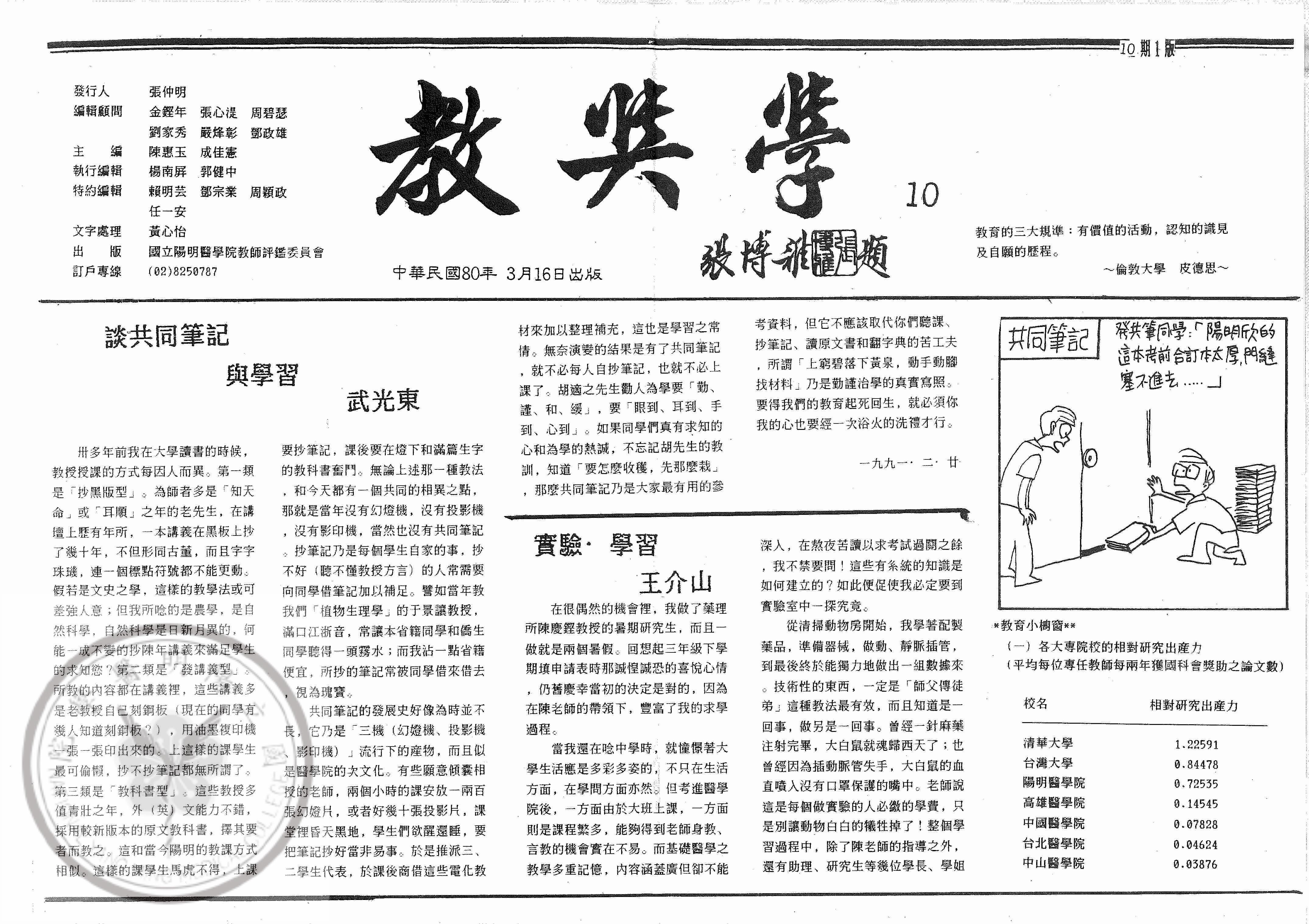 教與學第10期,內容:淺談共同筆記與學習;實驗.學習;專題:醫學院學生的學習型態分布;EKG 成為..