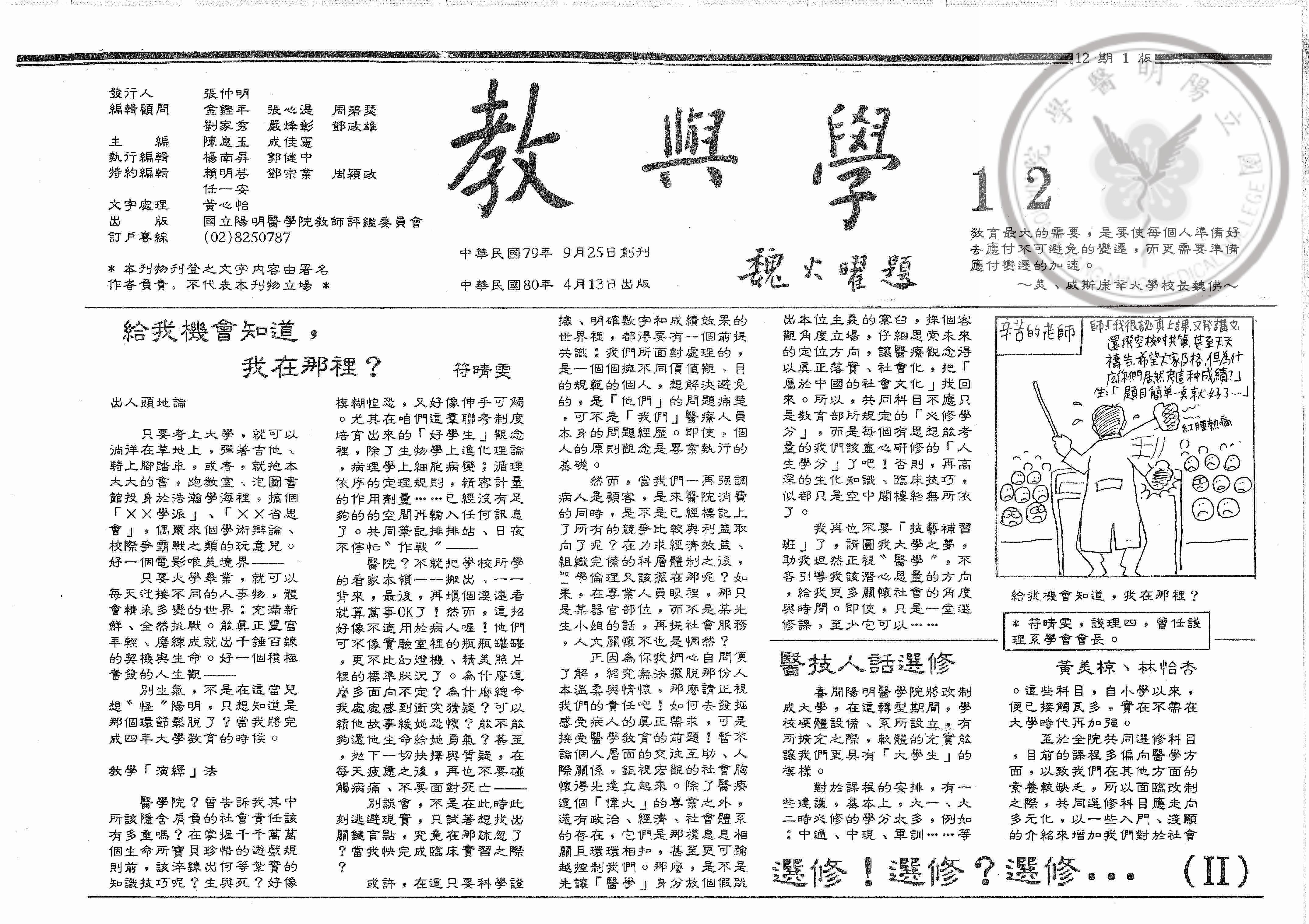 教與學第12期,內容:給我機會知道,我在那裡?;醫技人話選修;畢生奉獻醫學的魏火曜教授;我們從哪裡..