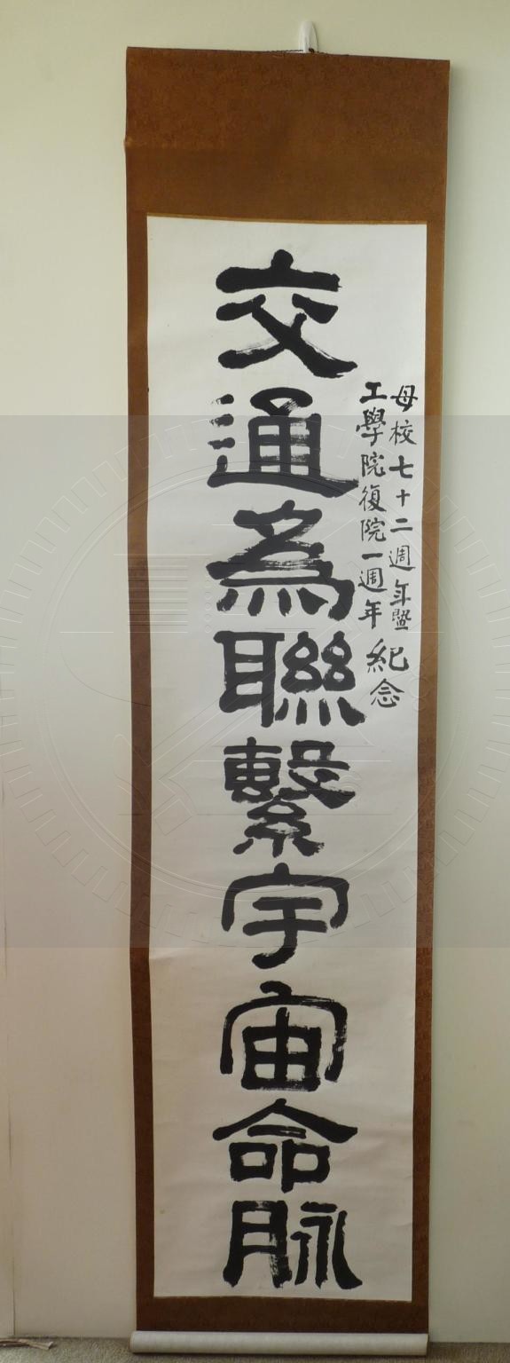 母校七十二週年暨工學院復院一週年紀念-丘原李友祥撰書。內容:交通為聯繫宇宙命脈。(卷軸)