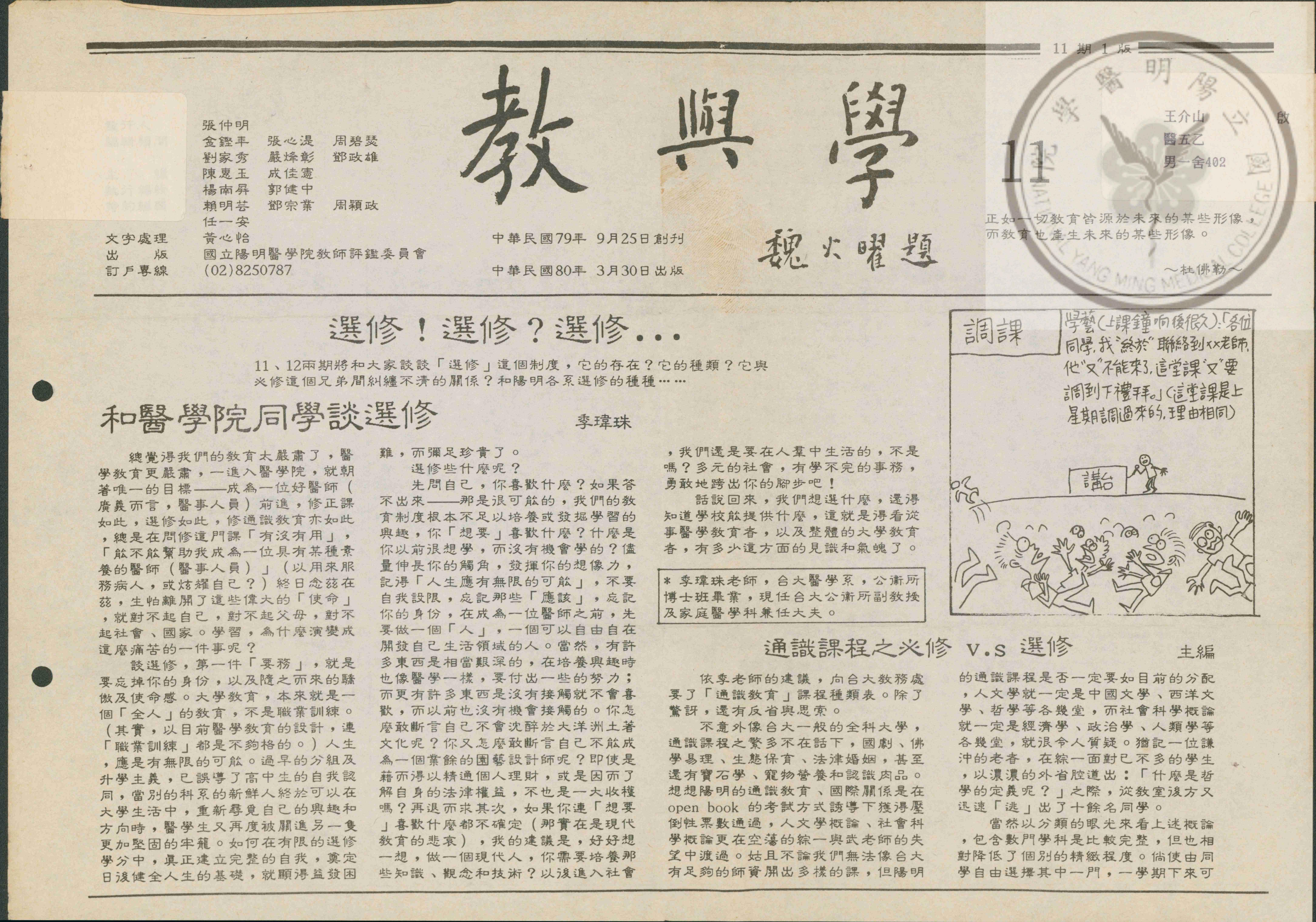 教與學第11期,內容:和醫學院同學談選修;通識課程之必修 v.s. 選修;專題:醫學院學生的型態分..