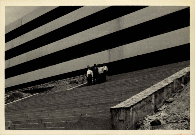實驗大樓完工後,六位委員站在太平梯上拍照。