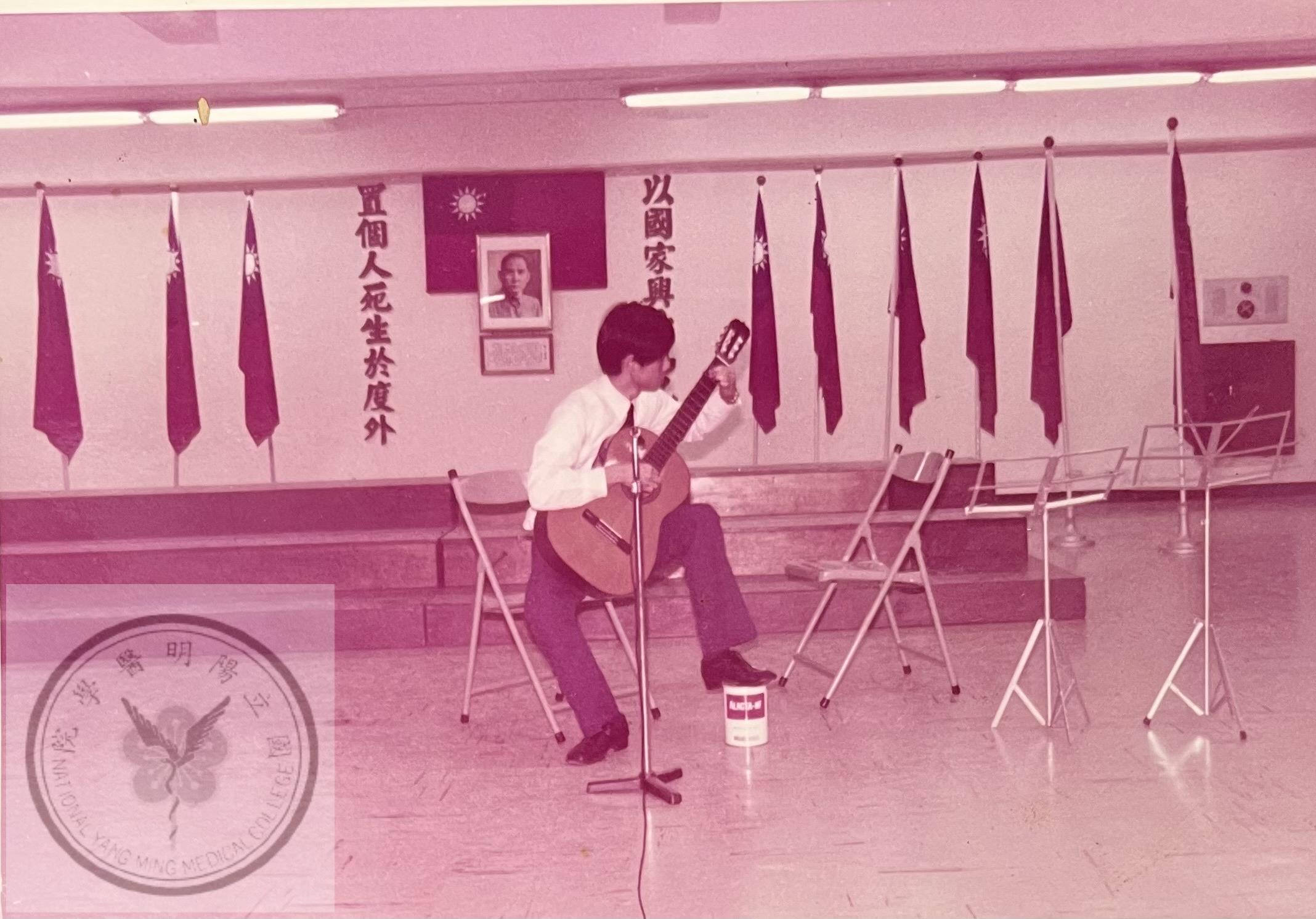 謝宏榮校友於陽明醫學院實驗大樓吉他演奏。/謝宏榮捐贈