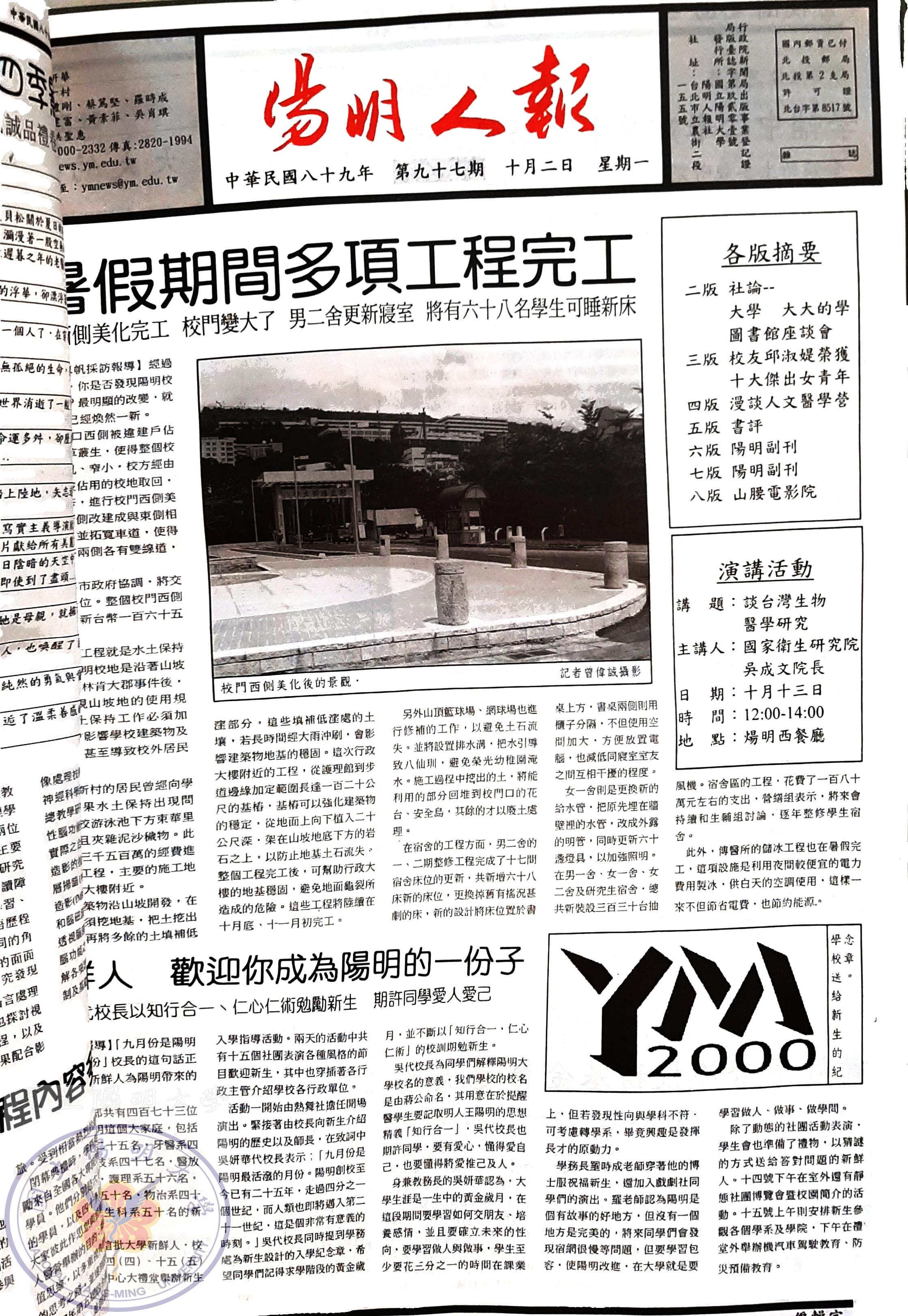 陽明人報 第九十七期,內容含:學習效能周末營;圖書館問題與回應座談會;第一屆神農坡文學獎頒獎;校友..