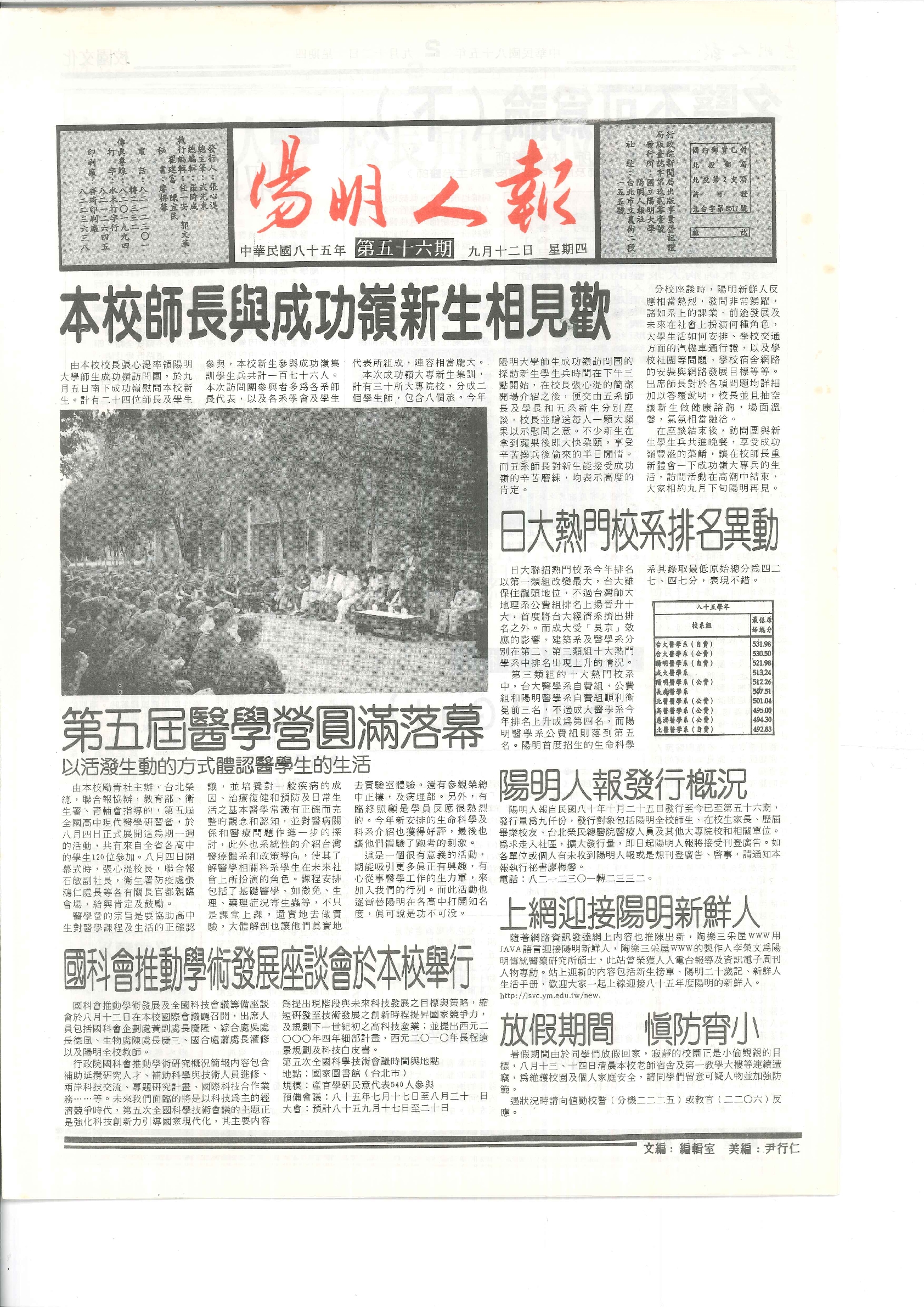陽明人報 第五十六期,內容含:陽明人報發行概況;國科會推動學術發展座談會於本校舉行等。/國立陽明大..