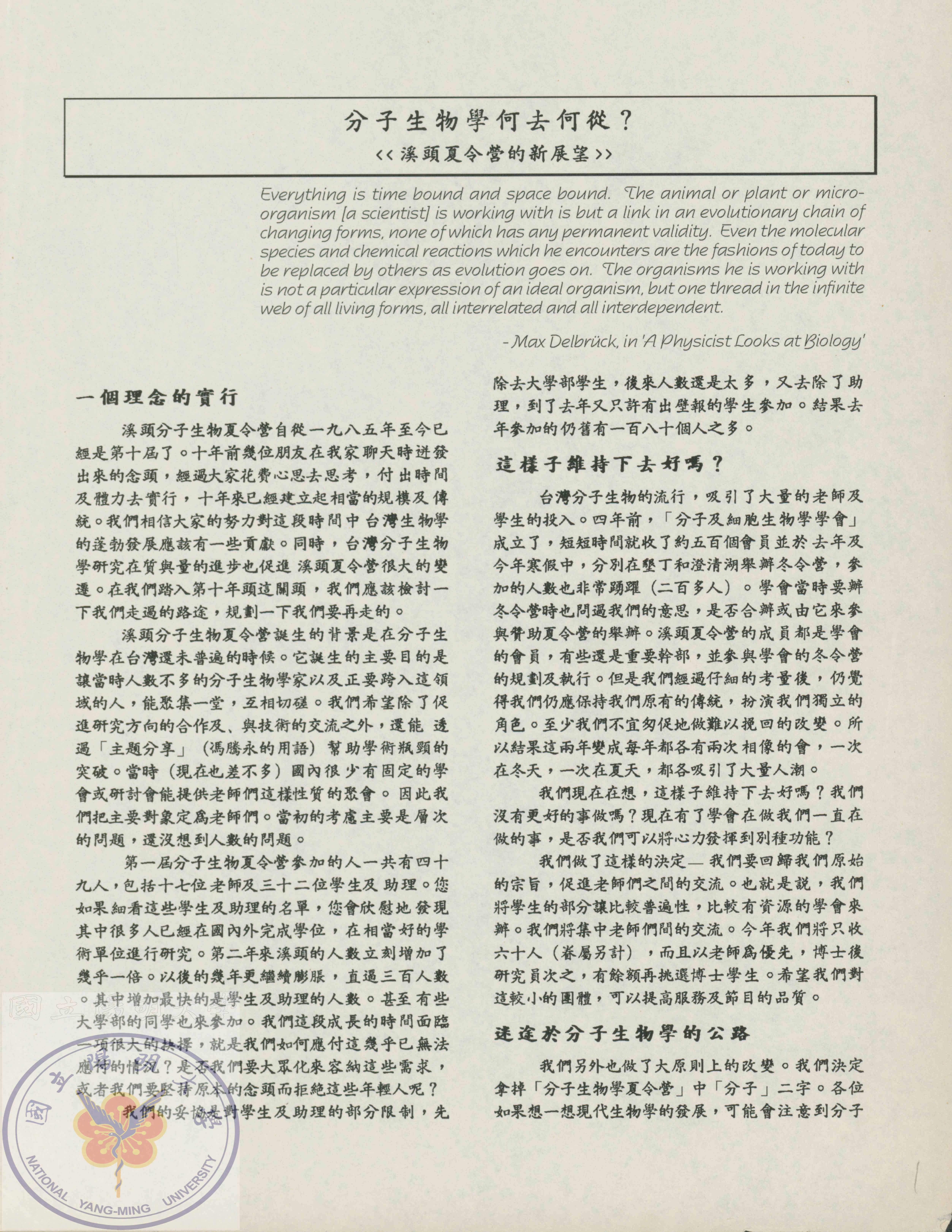 陳文盛老師於1994年5月13日寫下分子生物夏令營十週年改名聲明─分子生物學何去何從?>。/陳文盛..