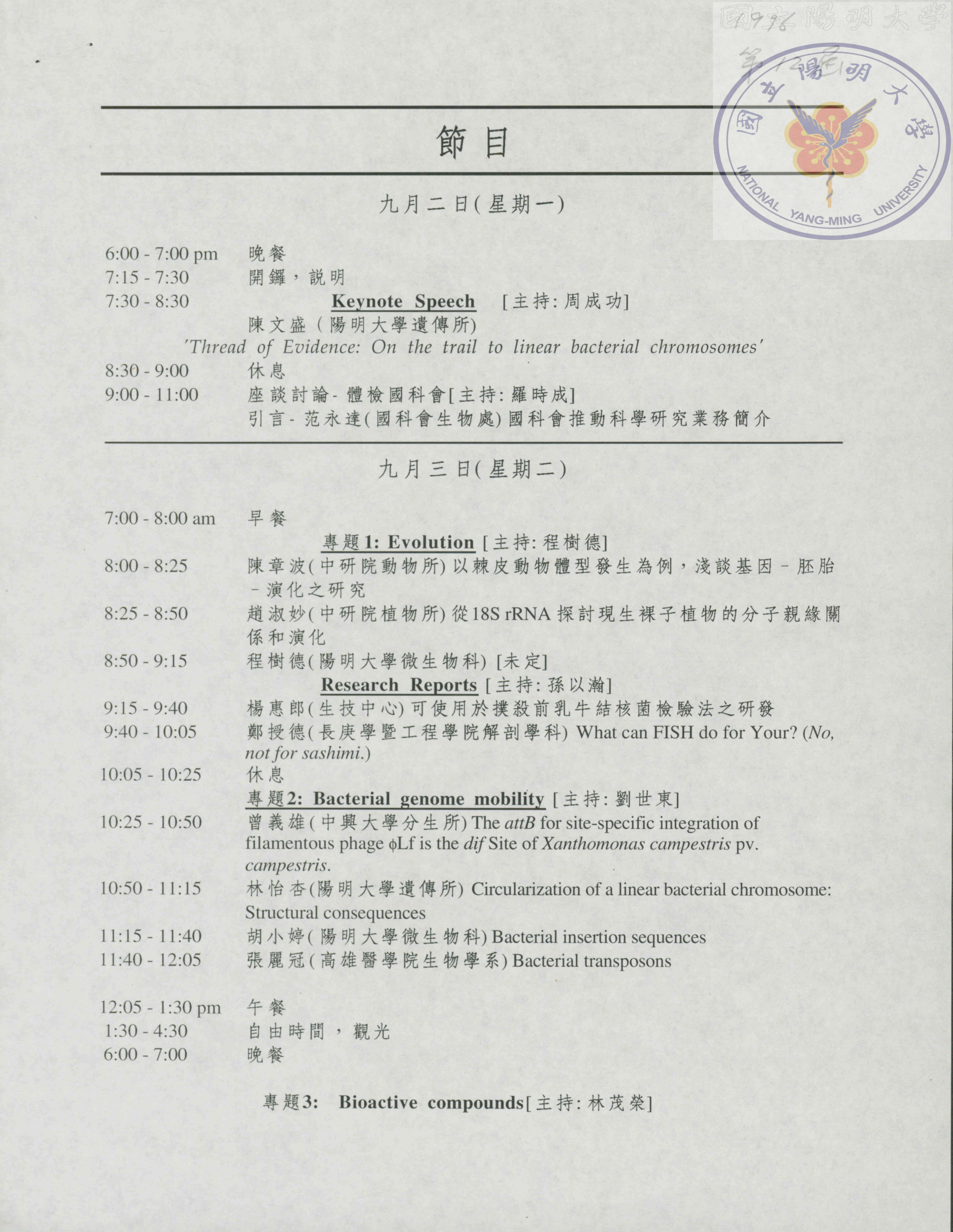 1996年明池第十二屆分子生物夏令營手冊,活動舉行於1993年9月2至4日於明池。籌辦委員:蔡錦華..