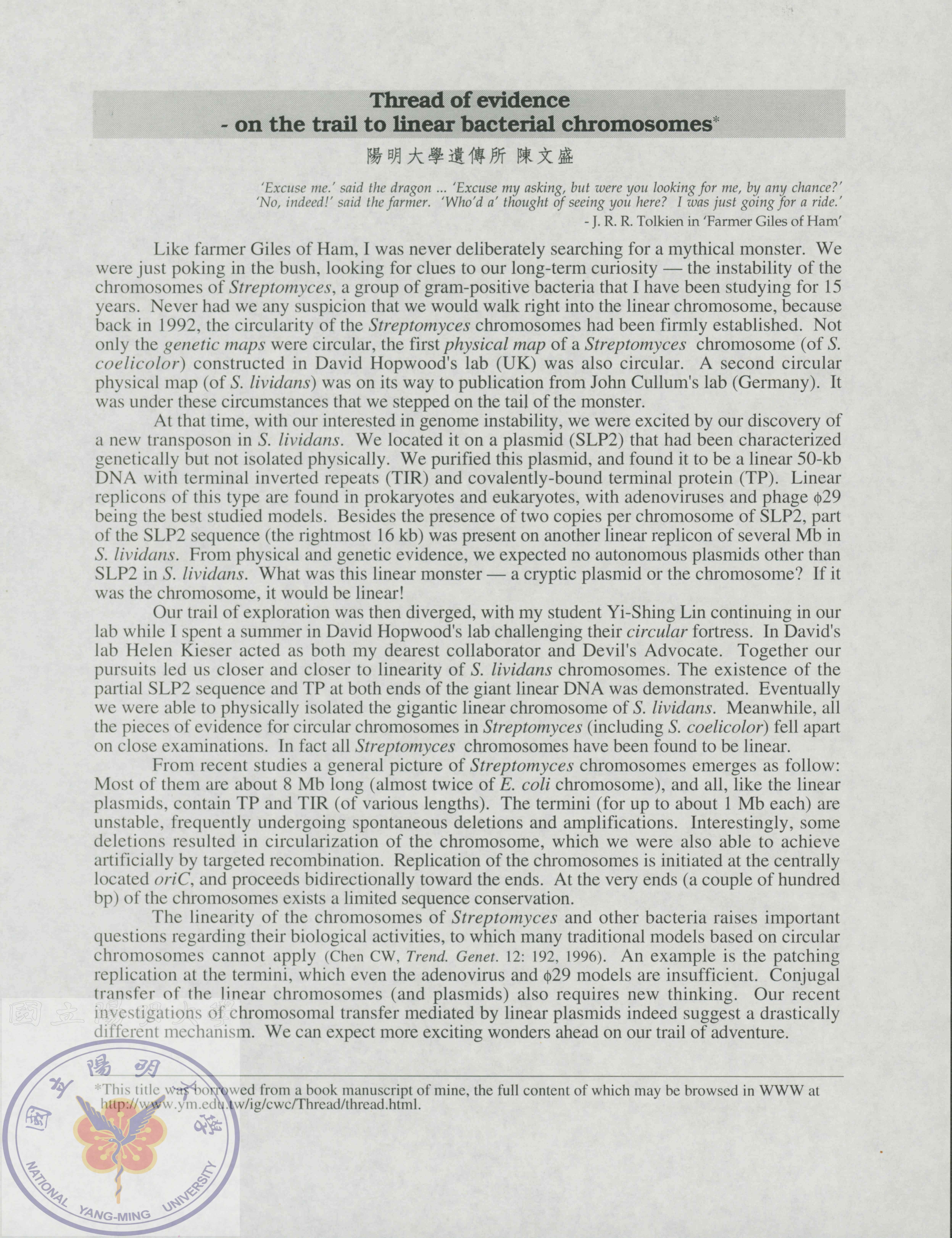 1996年第十二屆生物學夏令營keynote speech講稿 ─ "Thread of Euid..