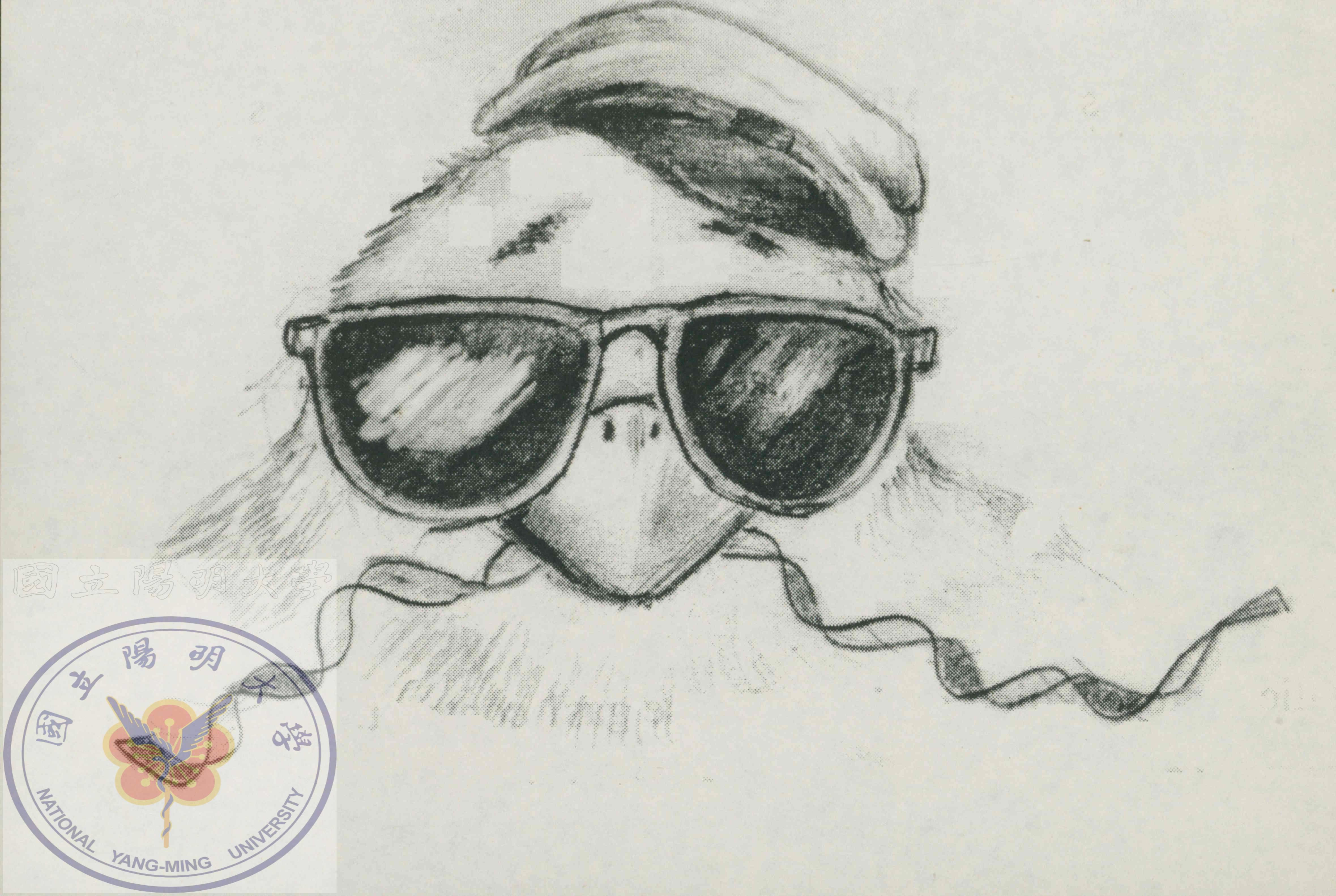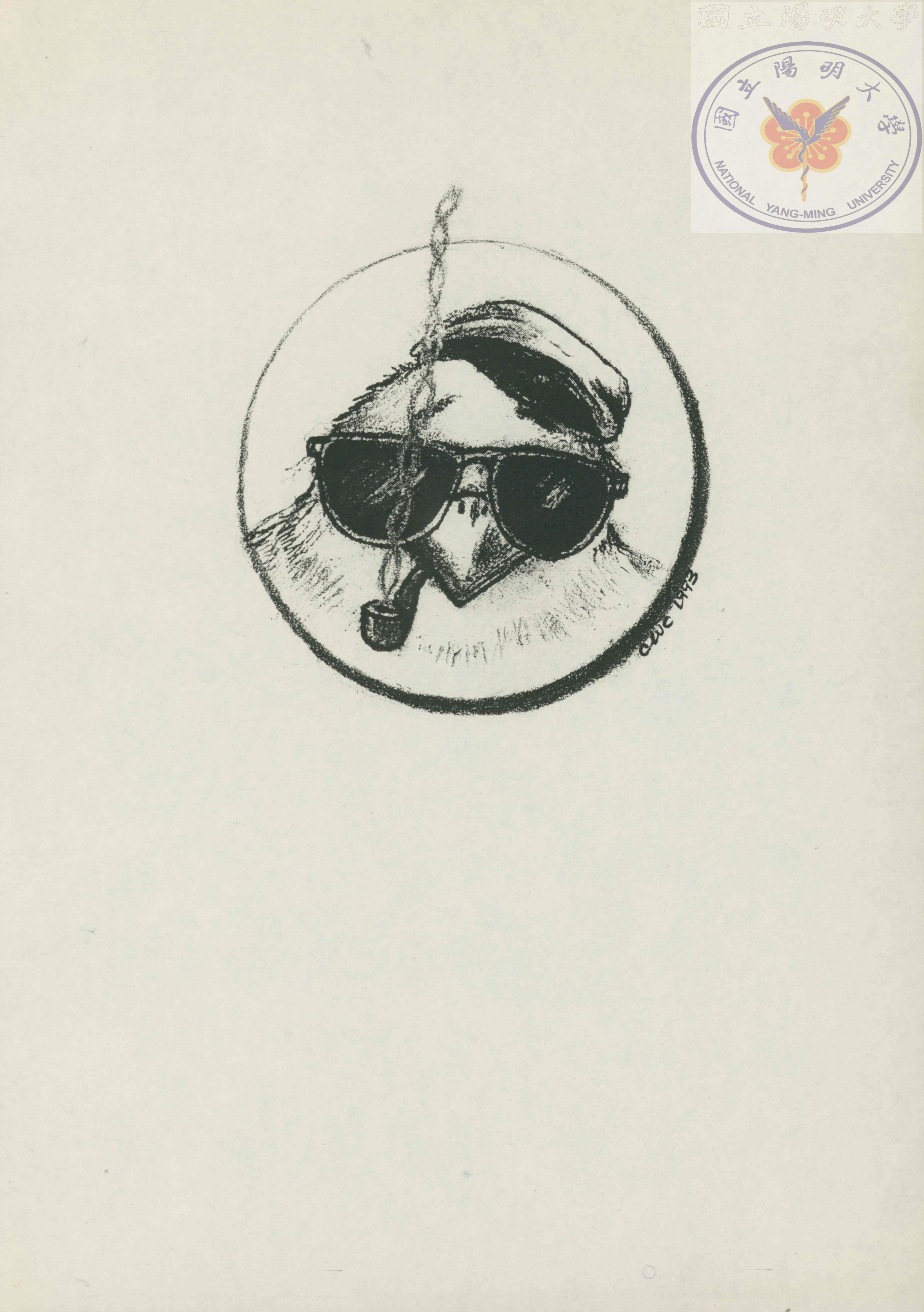 陳文盛老師繪製的生物夏令營T恤設計圖,圖像為戴墨鏡的鴿子。簽名時間為1993年。/陳文盛捐贈