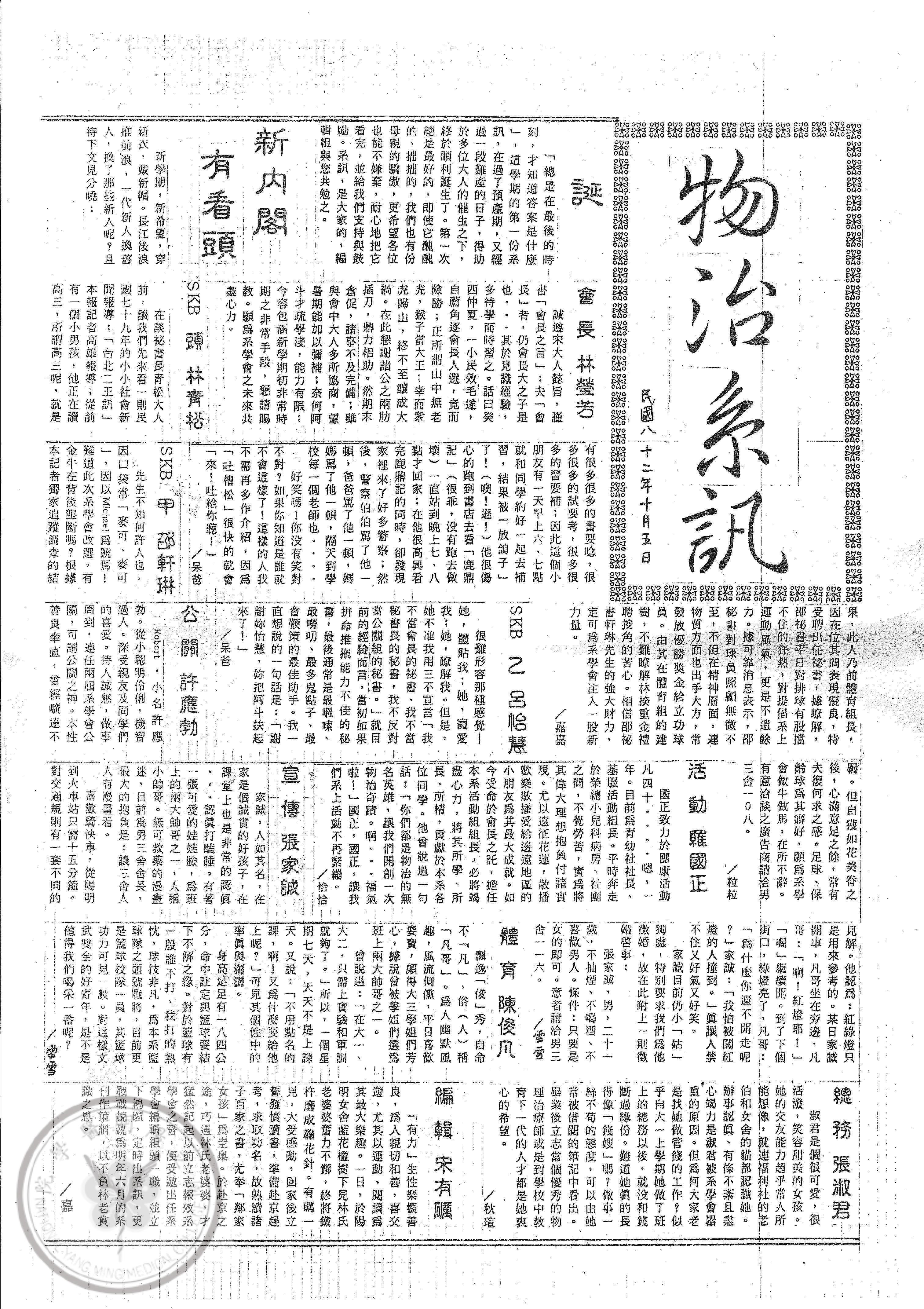 物治系訊第一期,內容:誕;新內閣有看頭;迎新花絮;話匣子。/學務處課輔組移交
