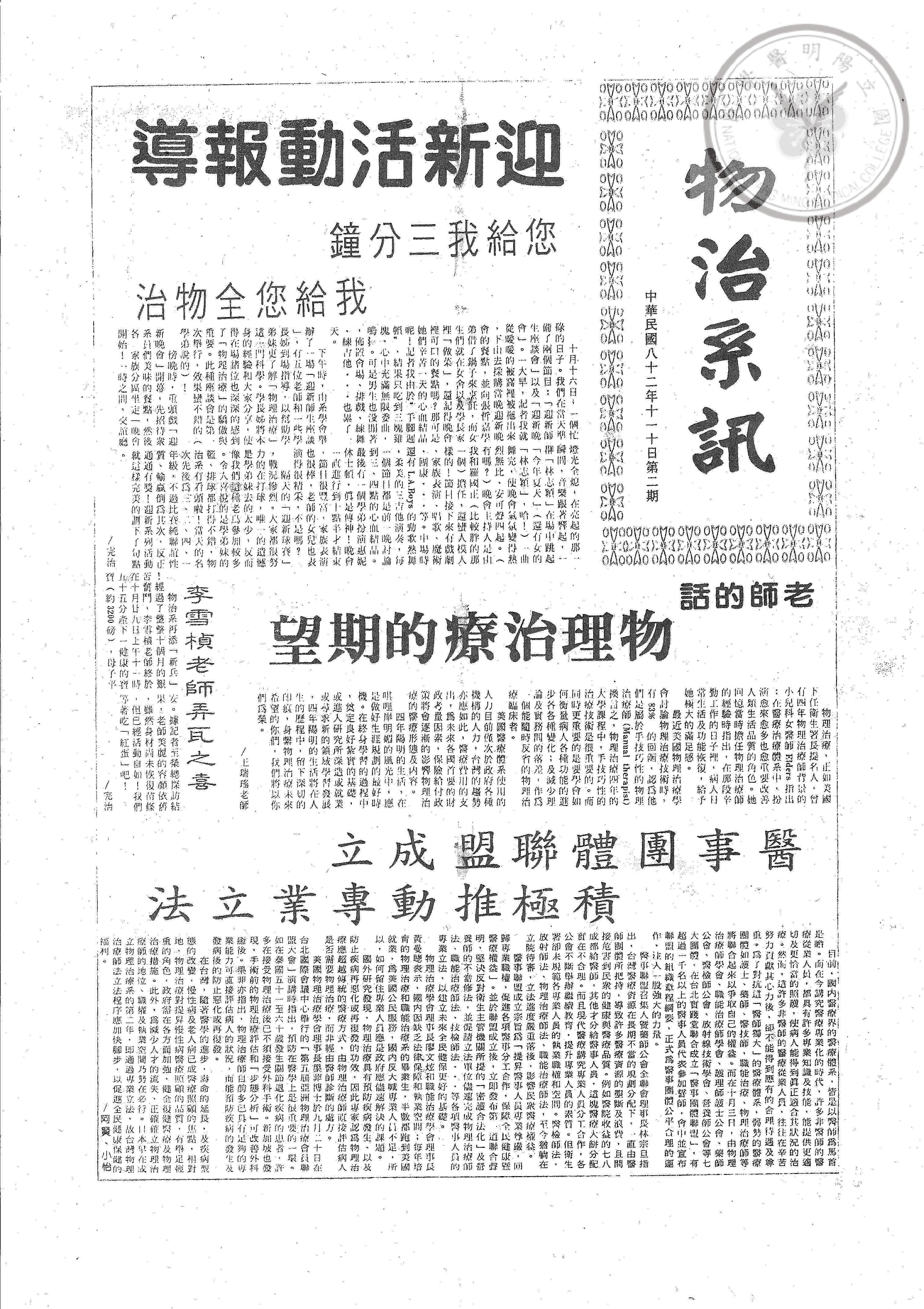 物治系訊第二期,內容:迎新活動報導 您給我三分鐘 我給您全物治;老師的話 物理治療的期望;李雪楨老..
