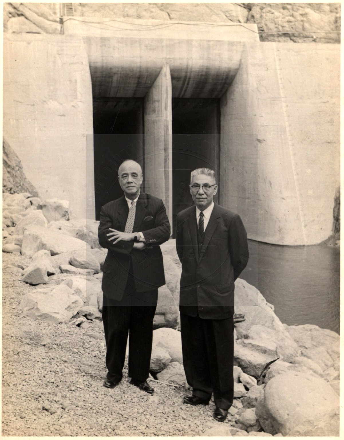 淩鴻勛先生攝於石門水庫導水隧道進水口。說明:1、民國51年10月。2、淩鴻勛 (左),淩先生於民國..