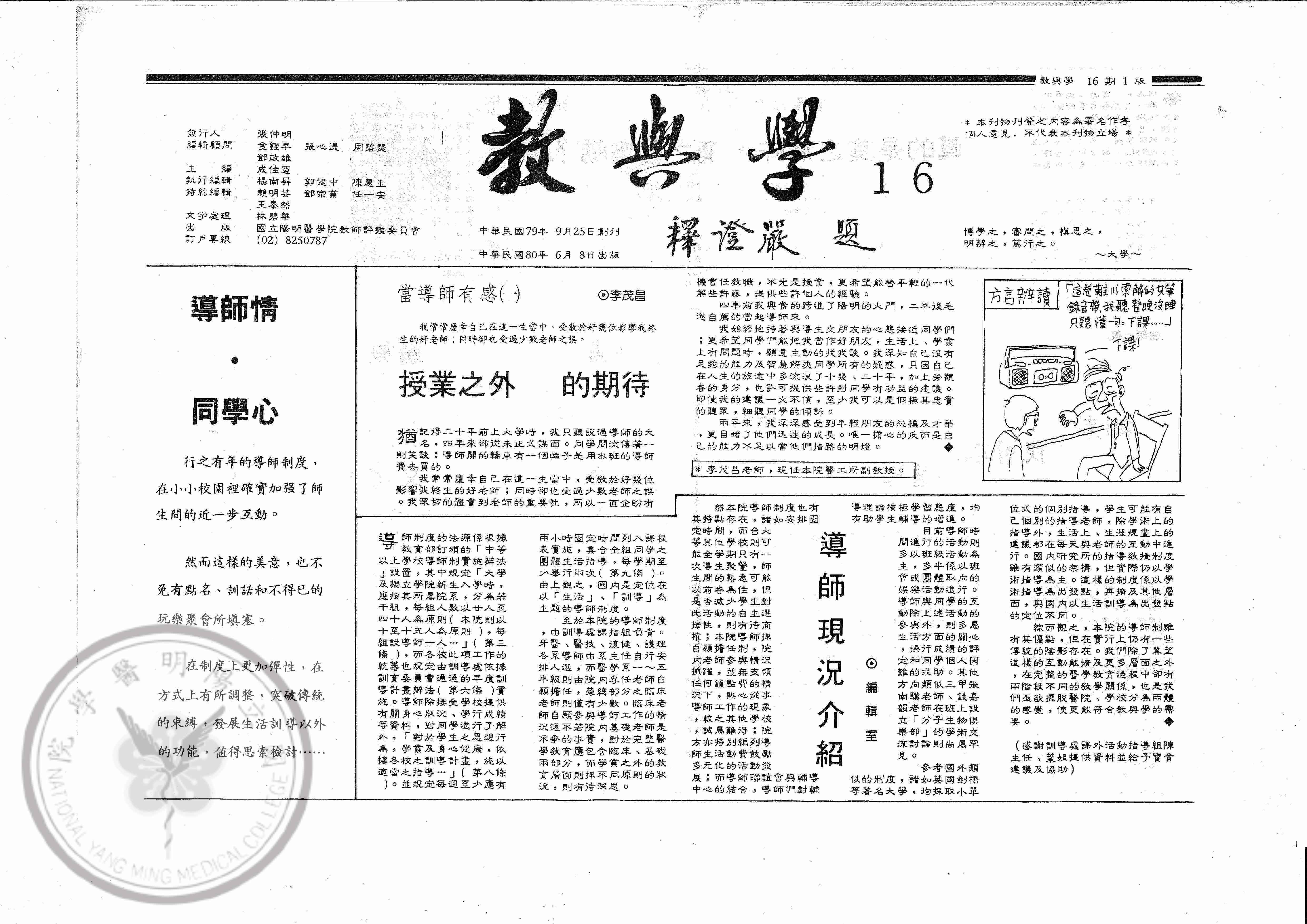 教與學第16期,內容:導師情・同學心;當導師有感(一)授業之外的期待;導師現況介紹;當導師有感(二..