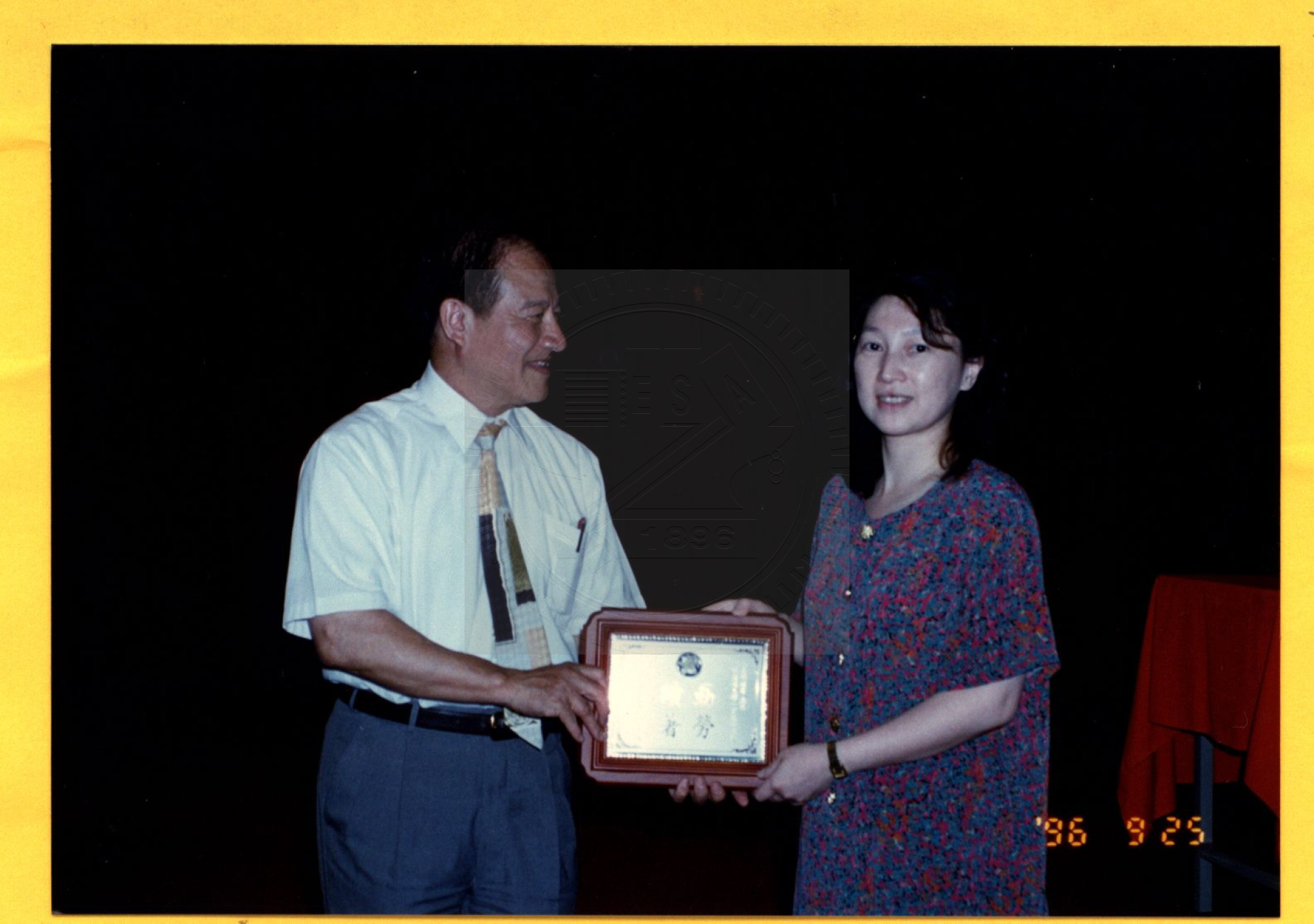 鄧啟福校長頒贈獎牌予校慶有功人員-蘇正芬老師 (民國85年9月25日)。蘇正芬 (右)。