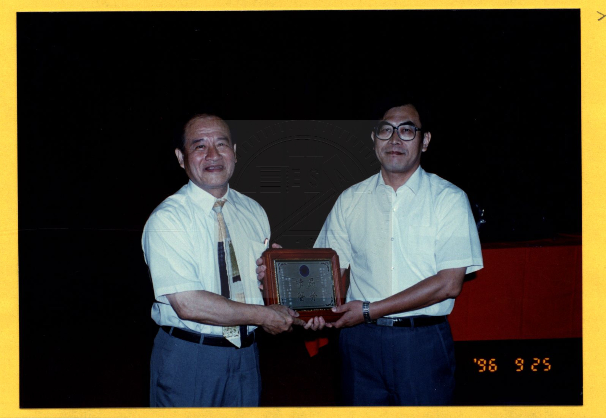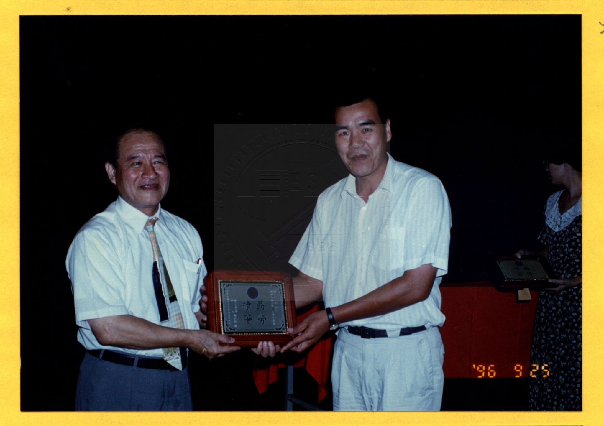 鄧啟福校長頒贈獎牌予校慶有功人員-黃世昌老師 (民國85年9月25日)。黃世昌 (右)。