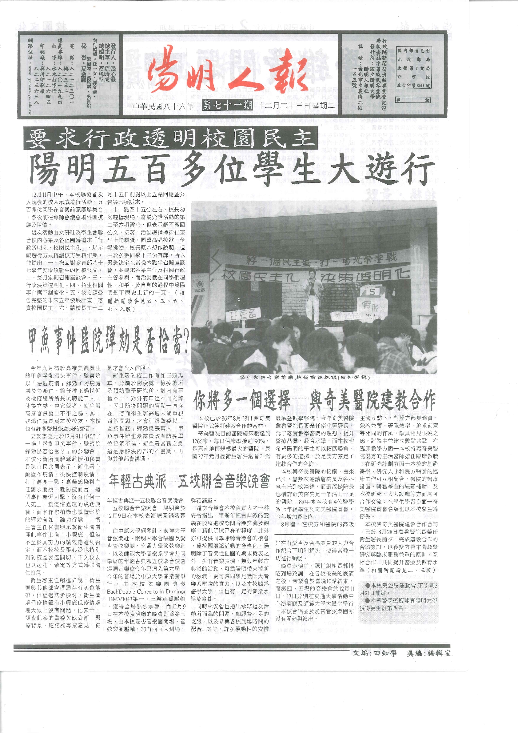 陽明人報 第七十一期,內容含:"要求行政透明校園民主 五百多位學生大遊行";與奇美醫院建教合作;五..