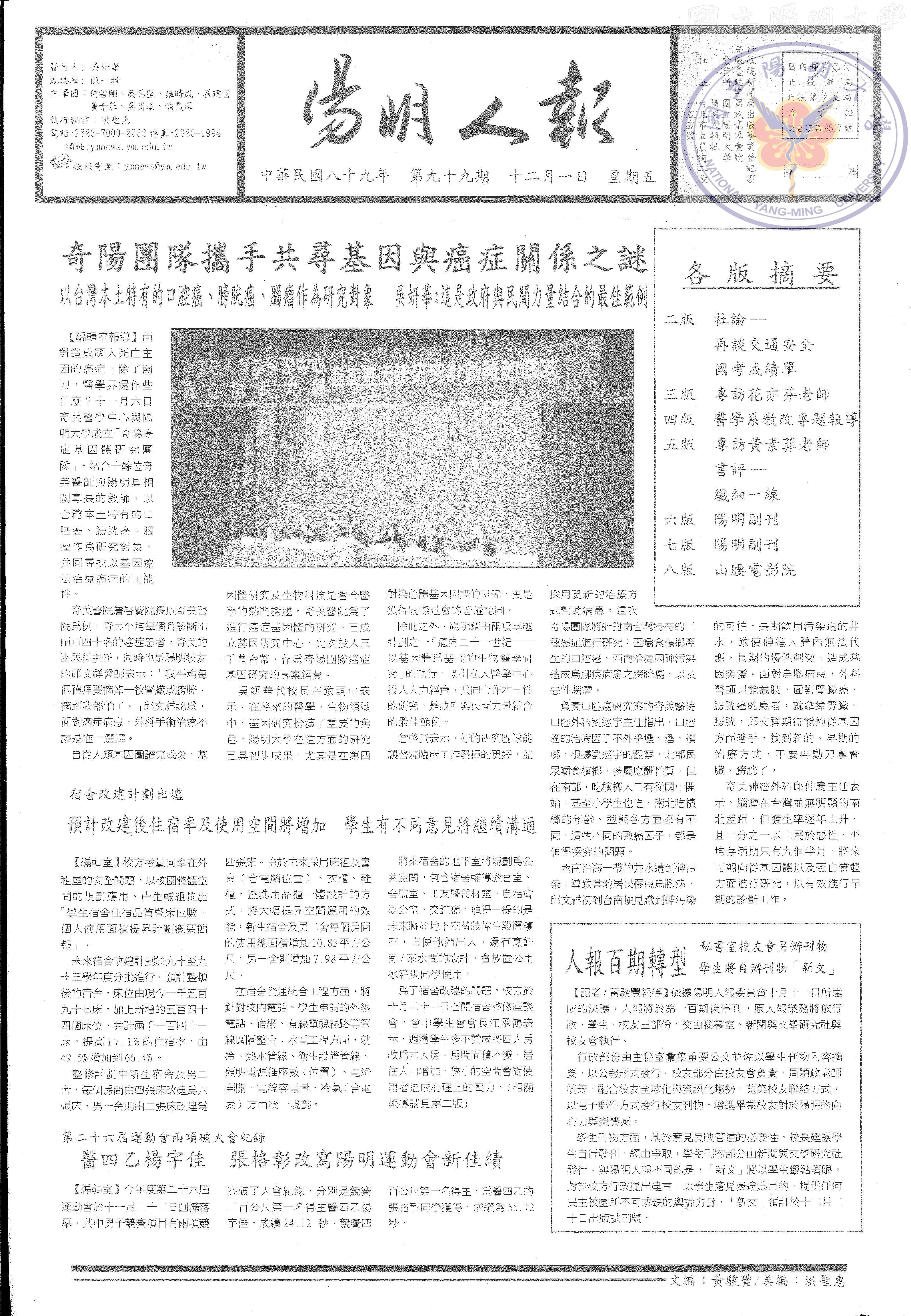 陽明人報 第九十九期,內容含:奇陽團隊攜手共尋基因與癌症關係之謎;宿舍改建計畫出爐; 秘書室校友會..
