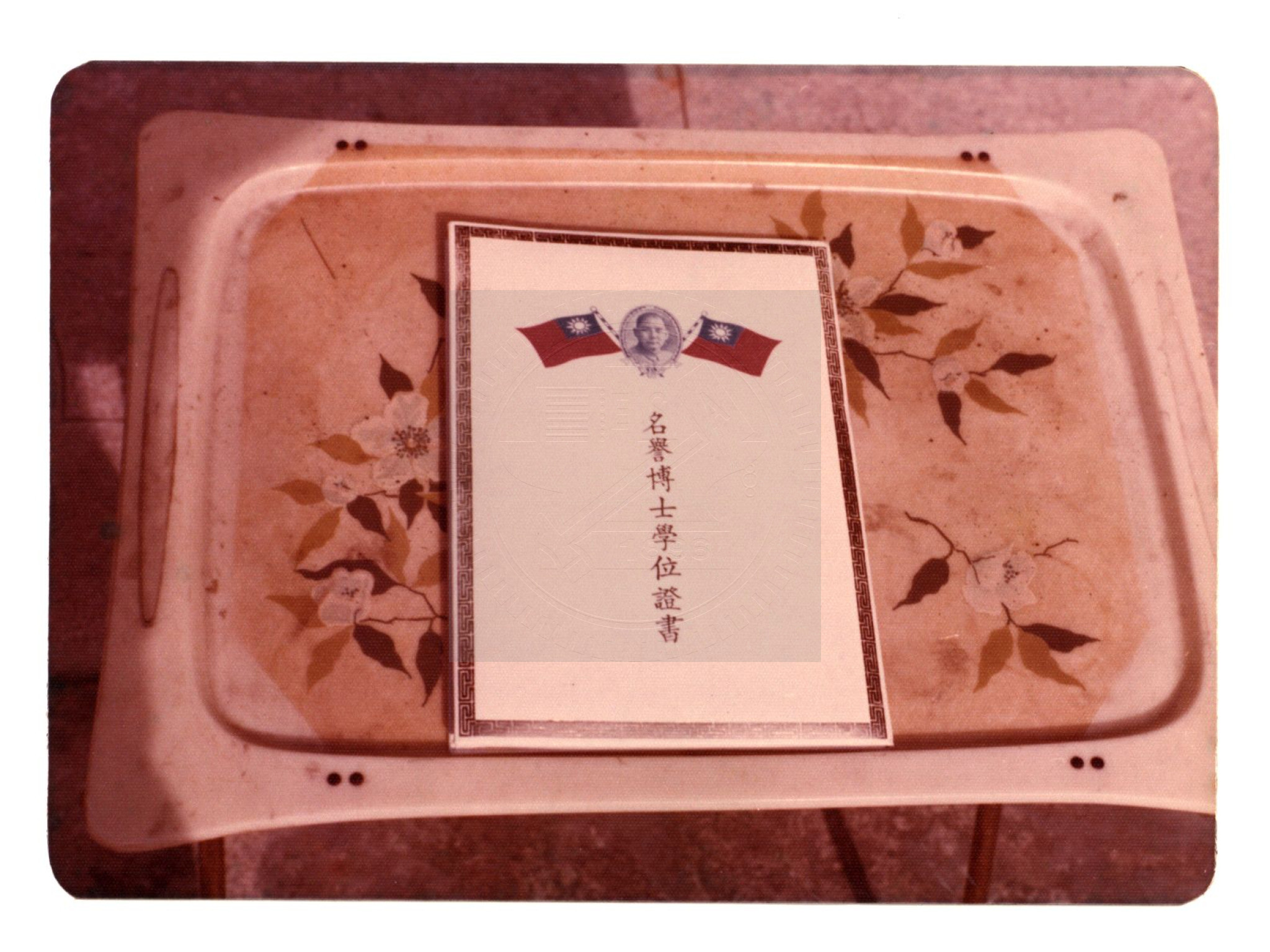 淩鴻勛先生獲交通大學名譽博士學位。右(二)盛慶琜校長。(淩鴻勛先生珍藏資料)