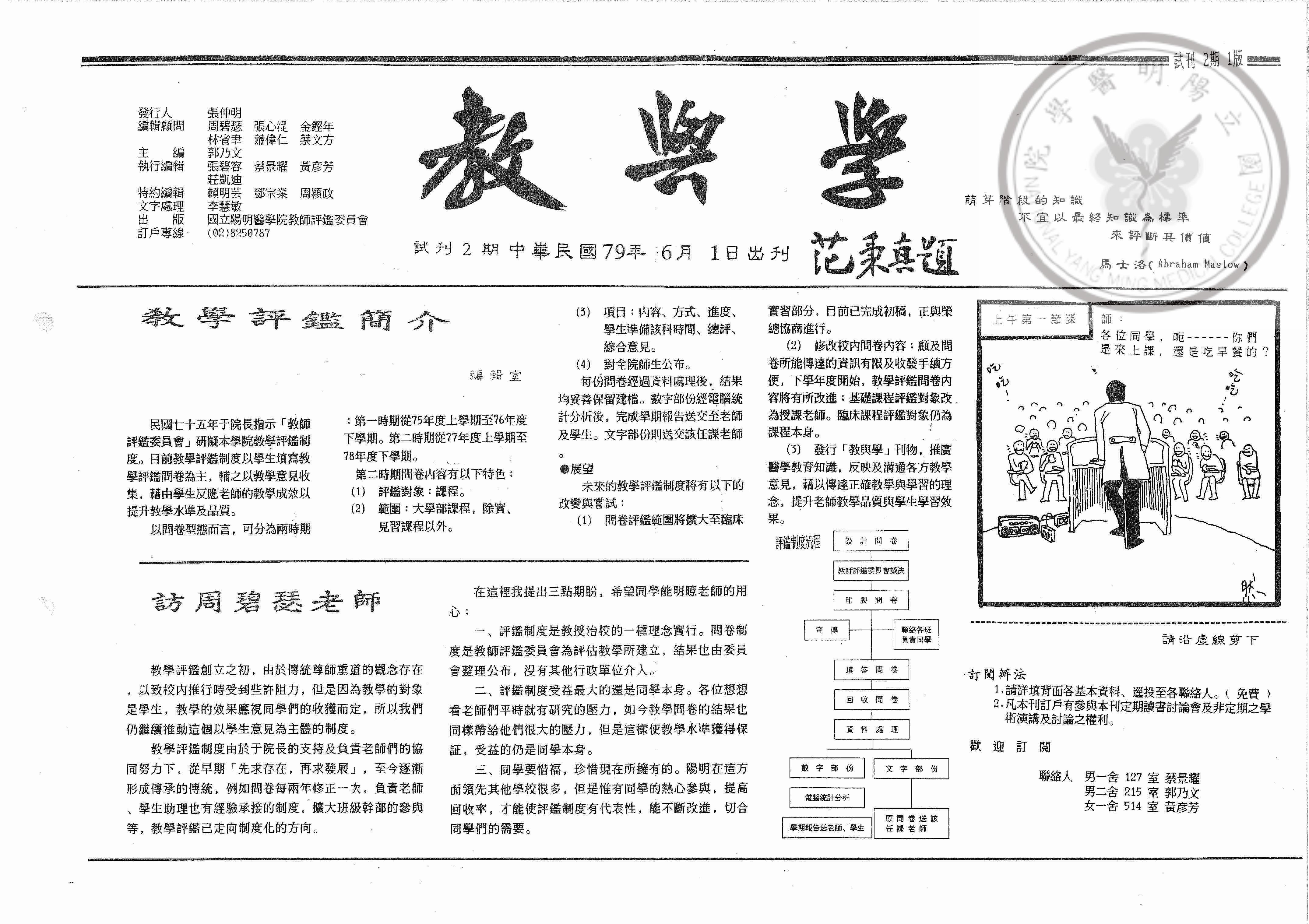 教與學試刊2期,內容:教學評鑑簡介;訪周碧瑟老師;陽明教學 VS. 石牌西施;新問卷 新嘗試;選舉..