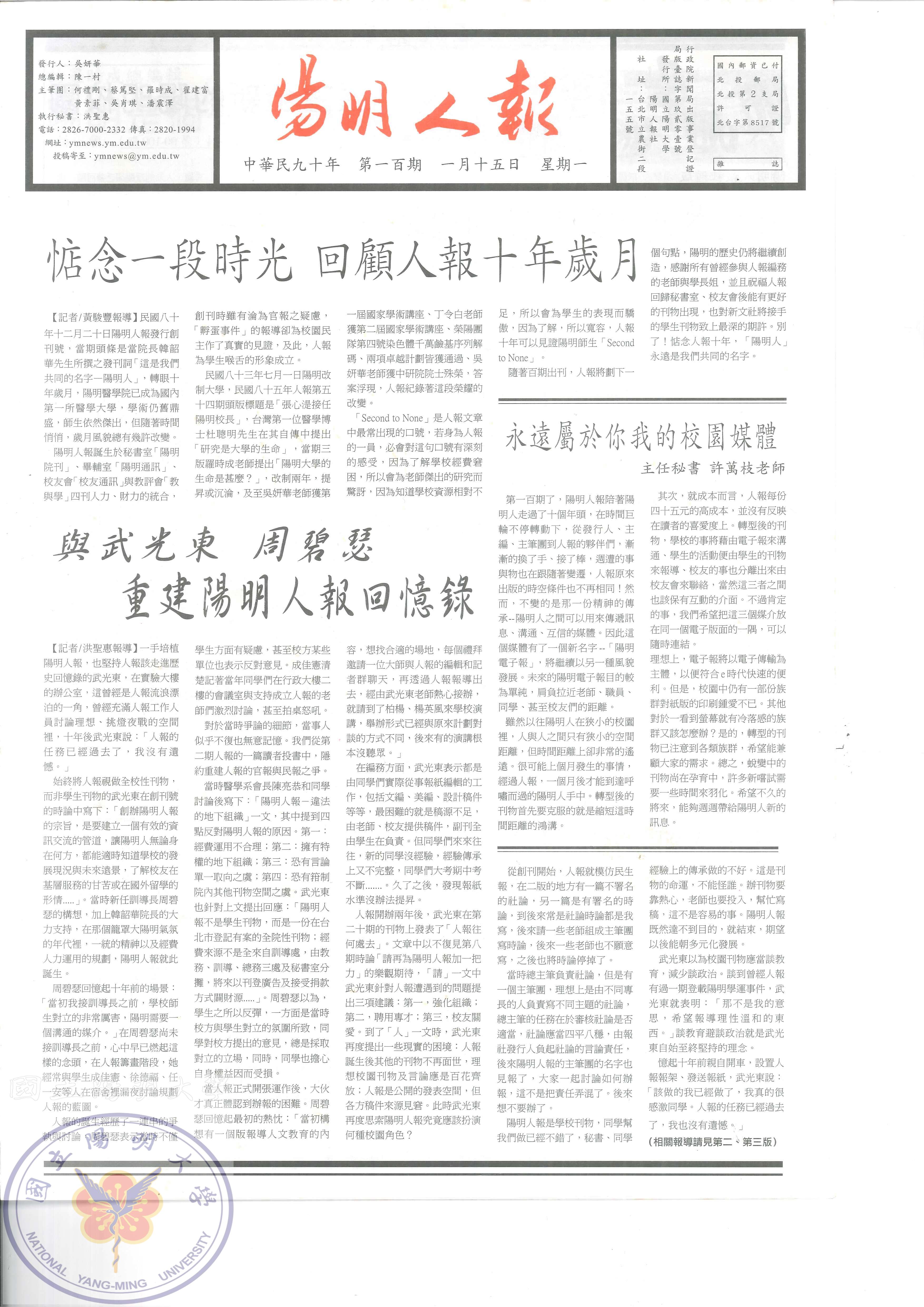 陽明人報 第一百期,內容含:回顧人報十年;重建陽明人報回憶錄;訪問三位總編輯遇到的困境;陽明人報師..