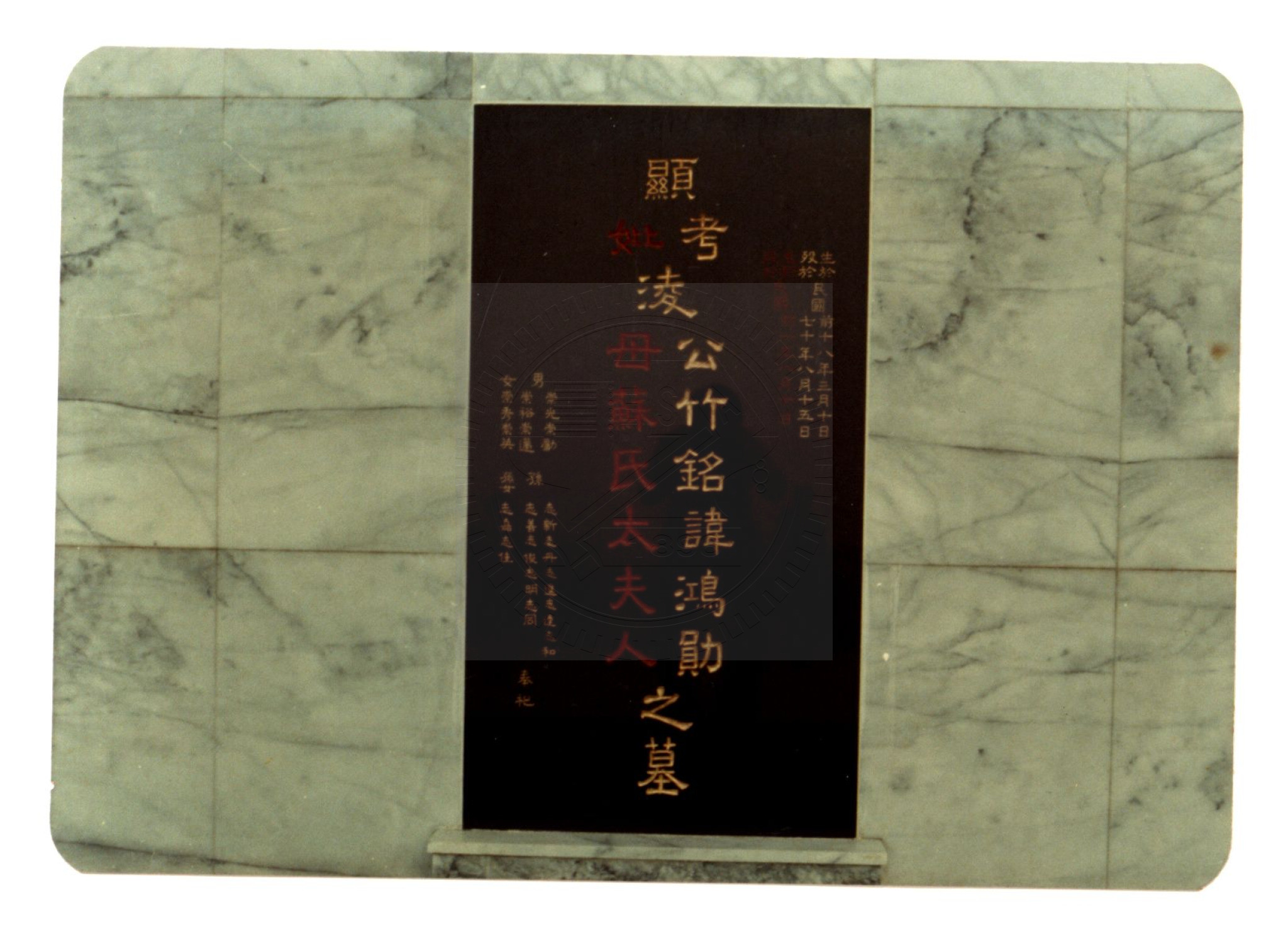 淩鴻勛先生親人於其墓前合影。說明:(右) 夫人蘇鳳平女士偕孫,(左) 媳錢玲女士攜女合影。