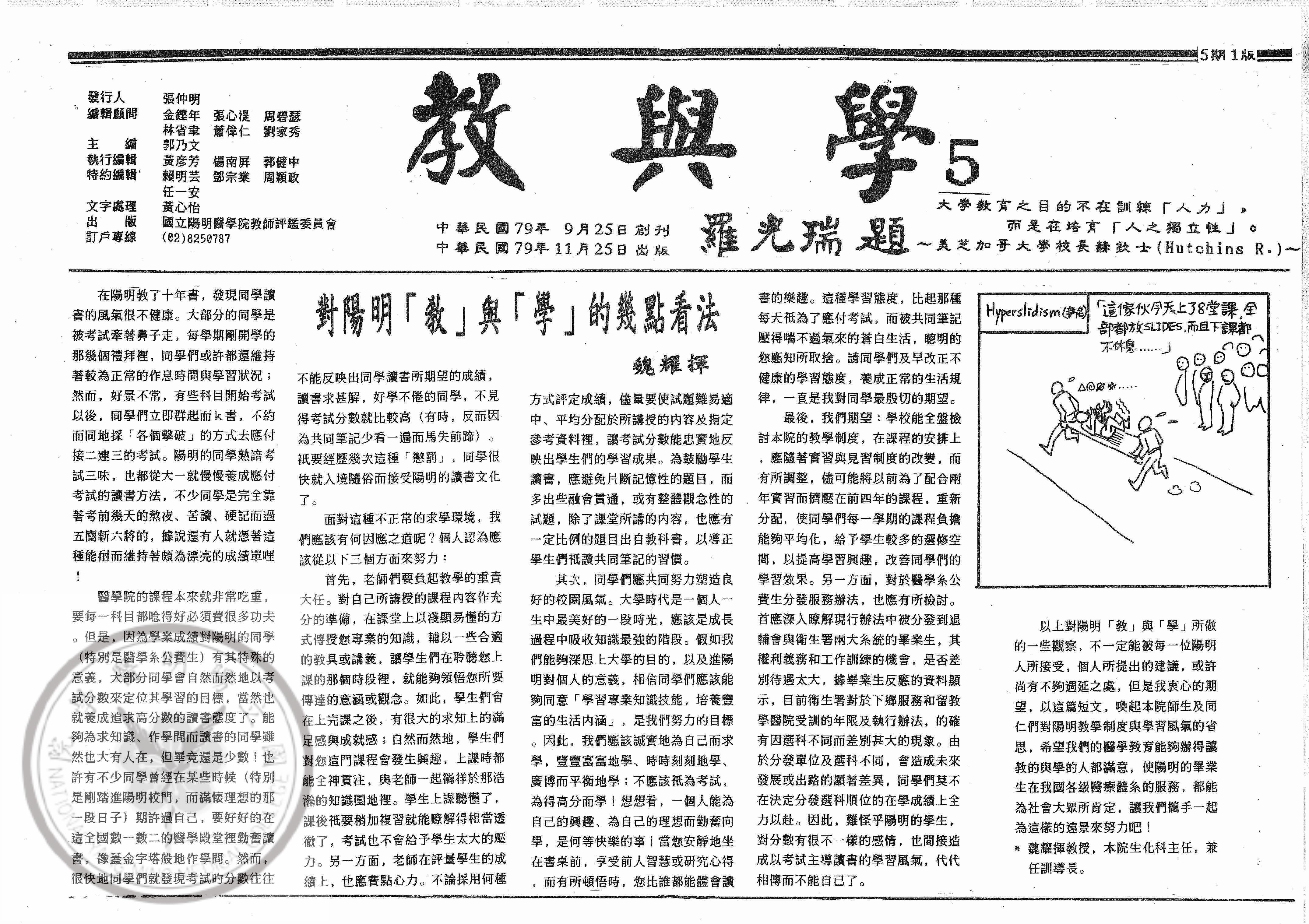 教與學第5期,內容:對陽明「教」與「學」的幾點看法;醫學教育的方向(下);讀者投書;教與學的橋樑 ..