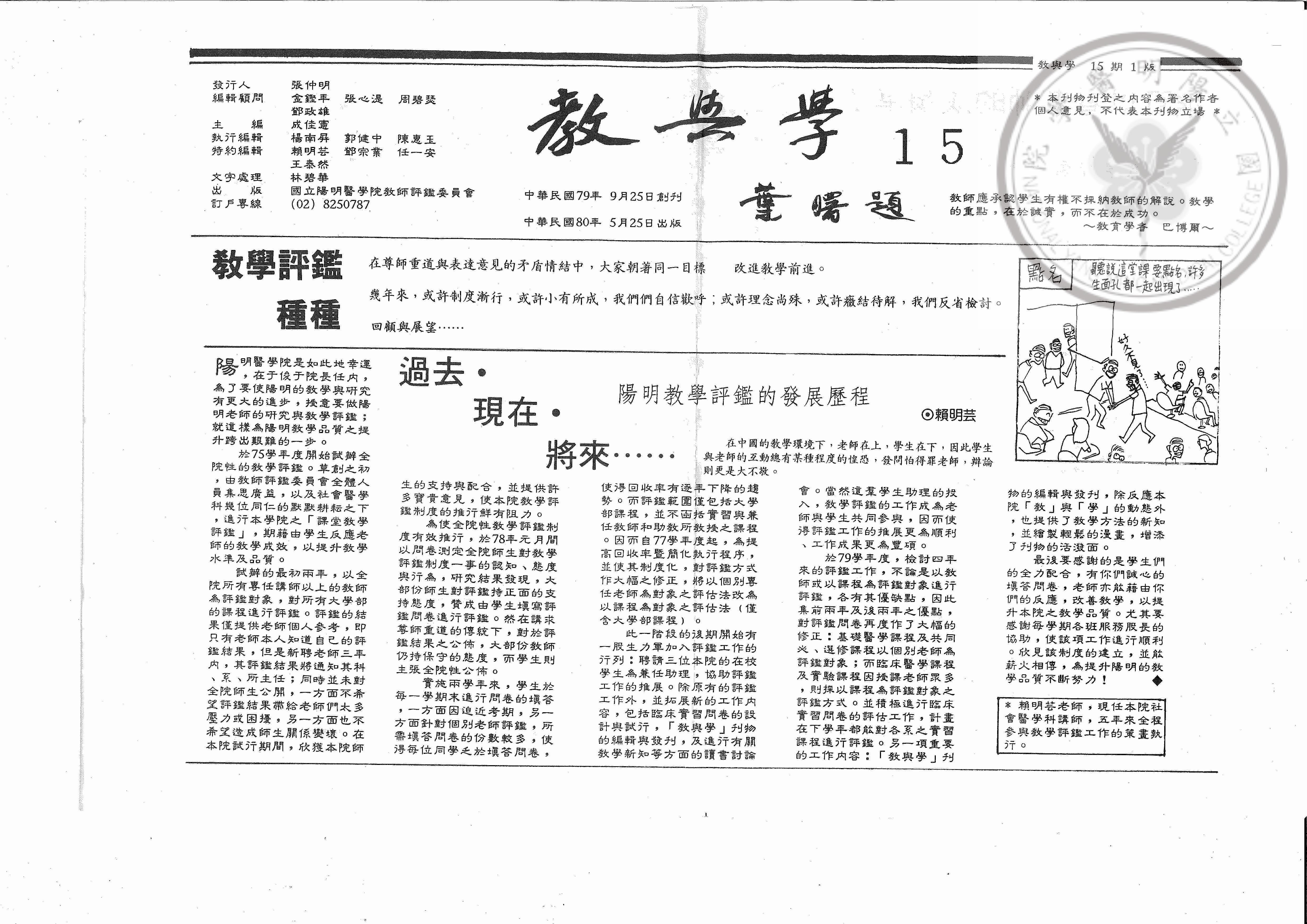 教與學第15期,內容:教學評鑑種種;過去・現在・未來……陽明教學評鑑的發展歷程;誰可以看老師的成績..