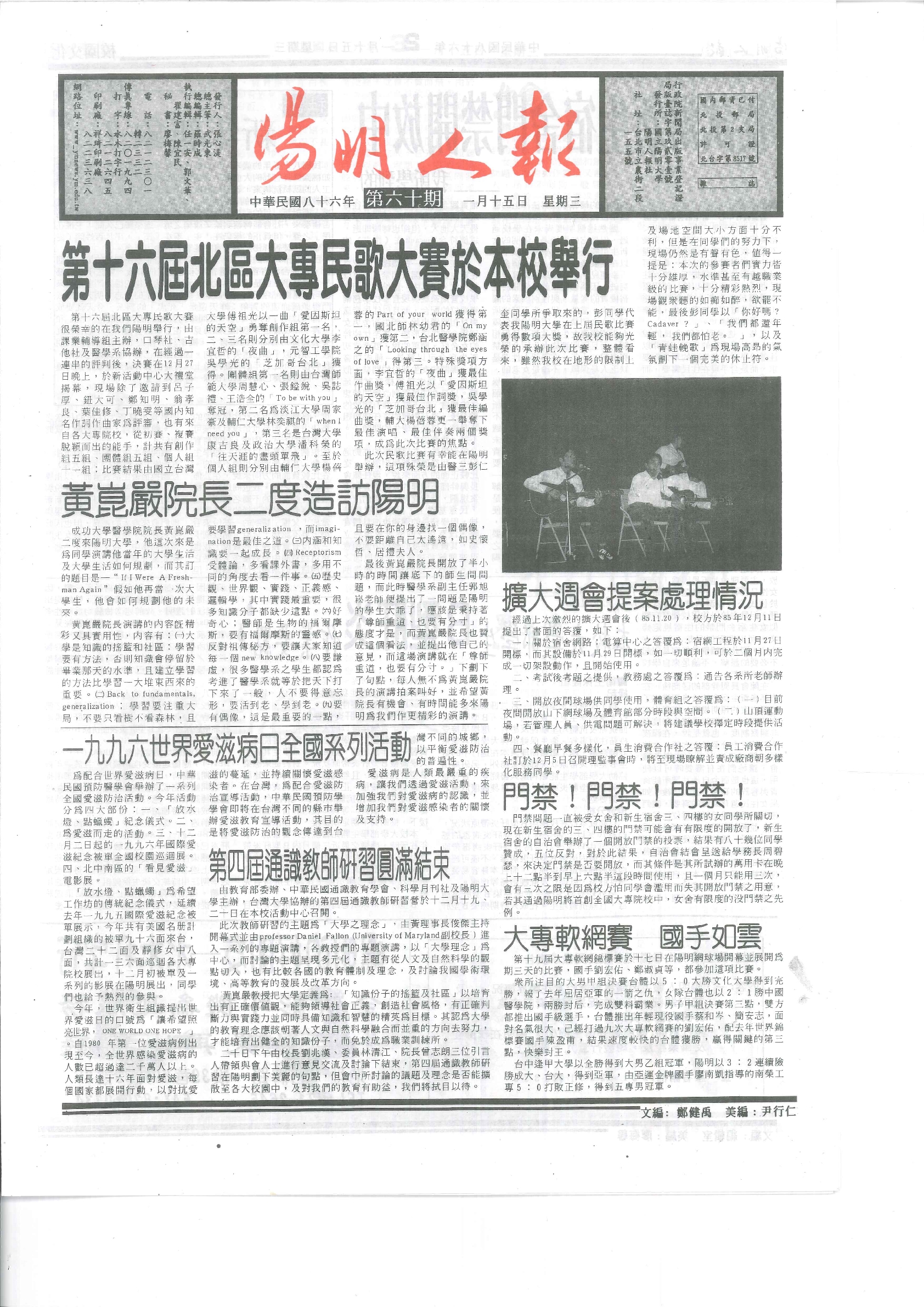 陽明人報 第六十期,內容含:黃崑嚴院長二度造訪陽明;擴大週會提案;醫技1・8系友回娘家等。/國立陽..