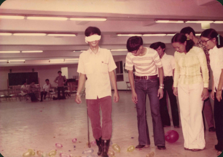 第九屆運動大會,學生戴起頭巾,在醫學館樹旁玩遊戲。