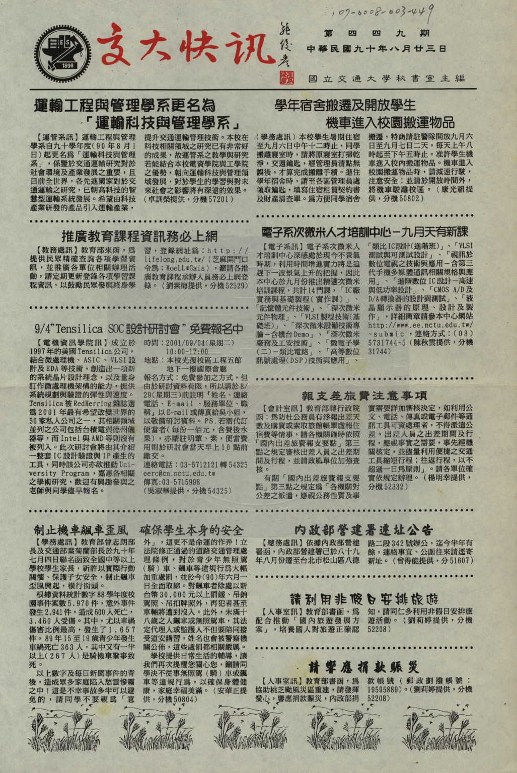 交大快訊 第四四九期,內容含:運輸工程與管理學系更名為「運輸科技與管理學系」。