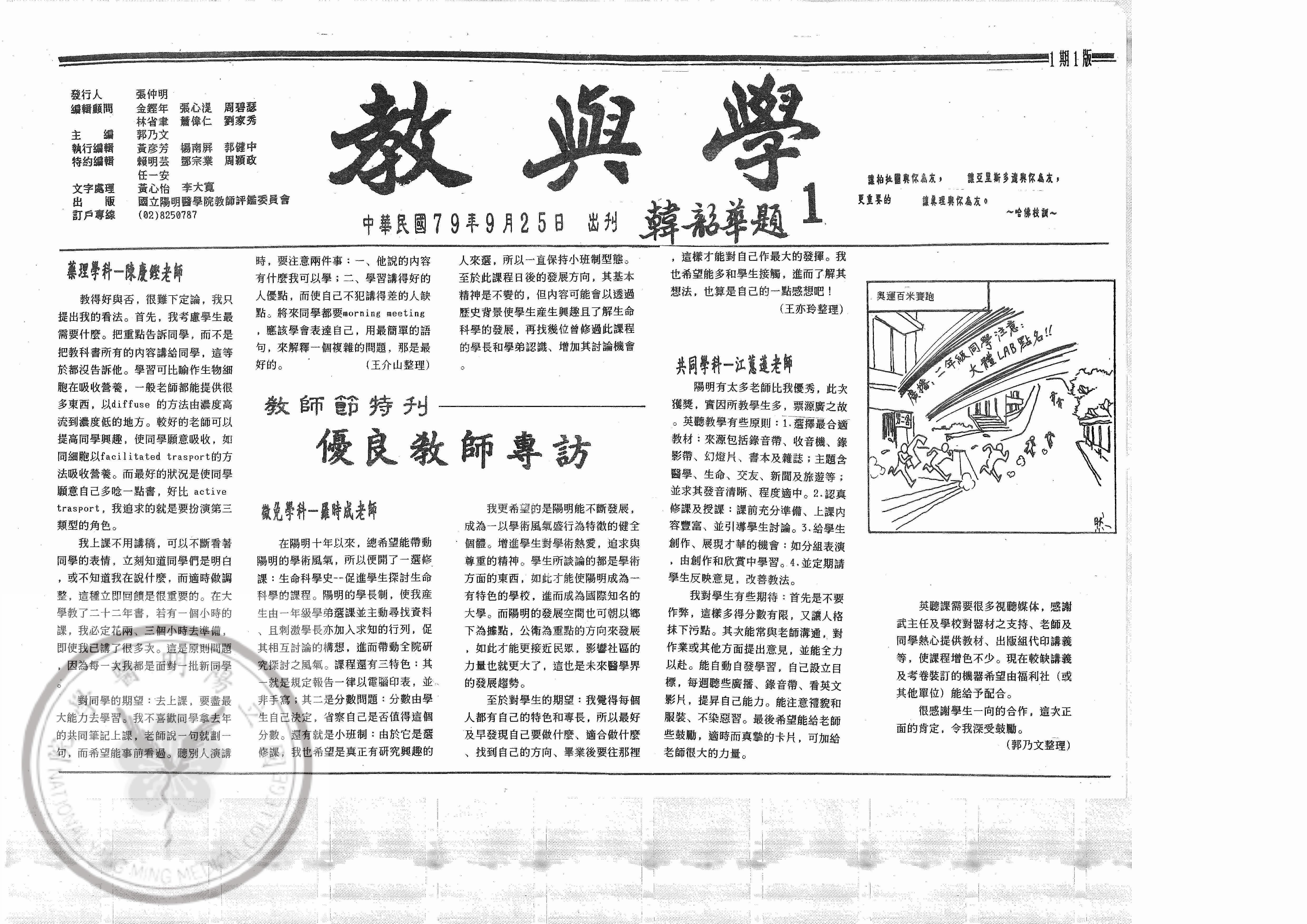 教與學第1期,內容:教師節特刊—優良教師專訪;藥理學科—陳慶鏗老師(1);微免學科—羅時成老師(2..