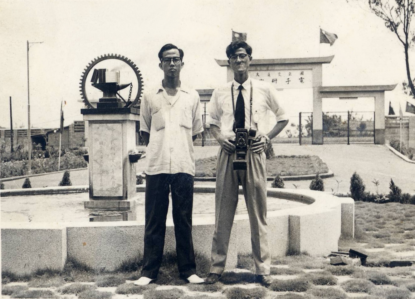 民國49年6月26日交大電子所第一屆畢業典禮,陳榮淦(右)與兄長陳榮銓合影於博愛校區飲水思源紀念碑..