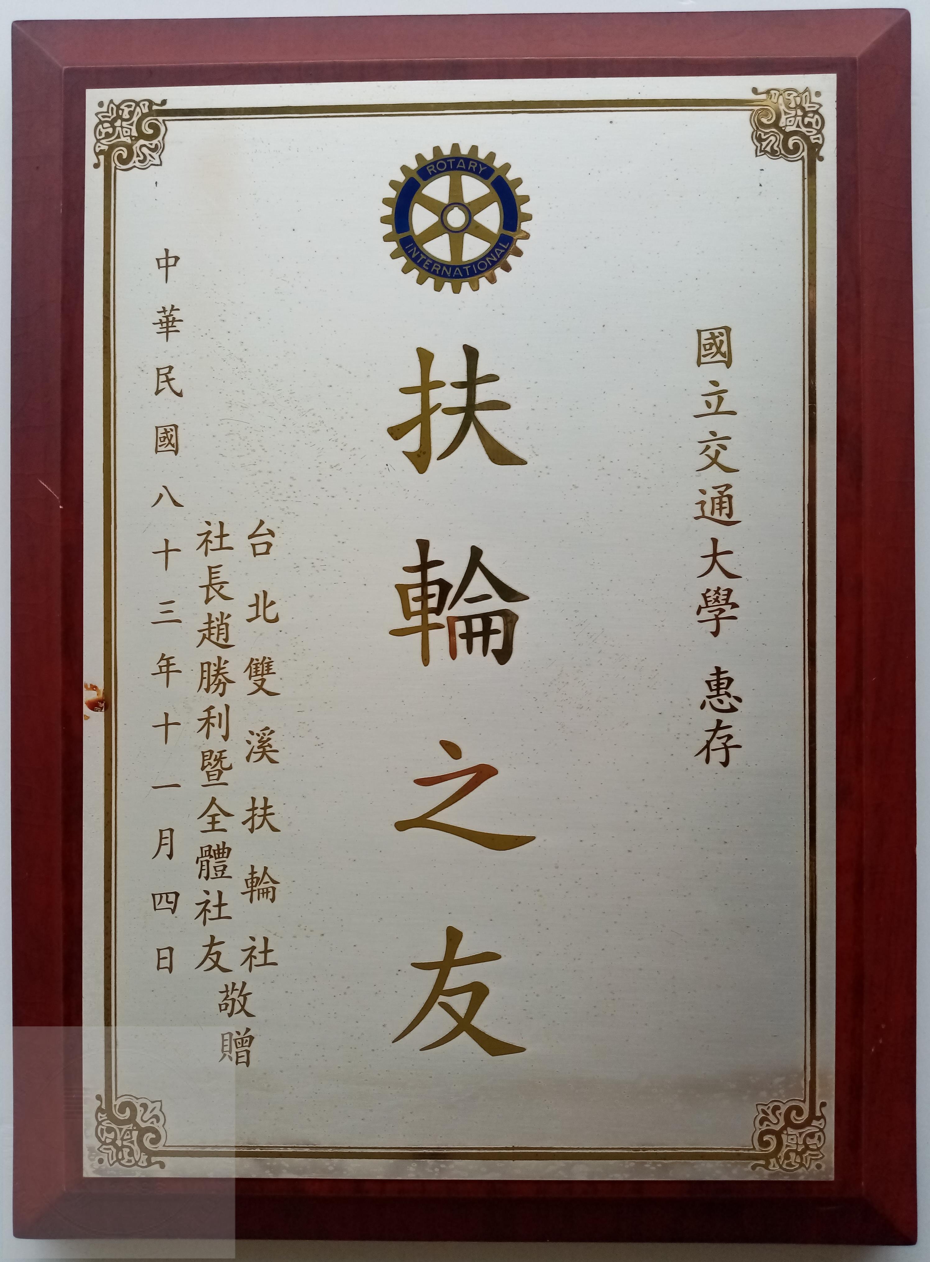 國立交通大學惠存-扶輪之友 (台北雙溪扶輪社敬贈 83.11.4)。