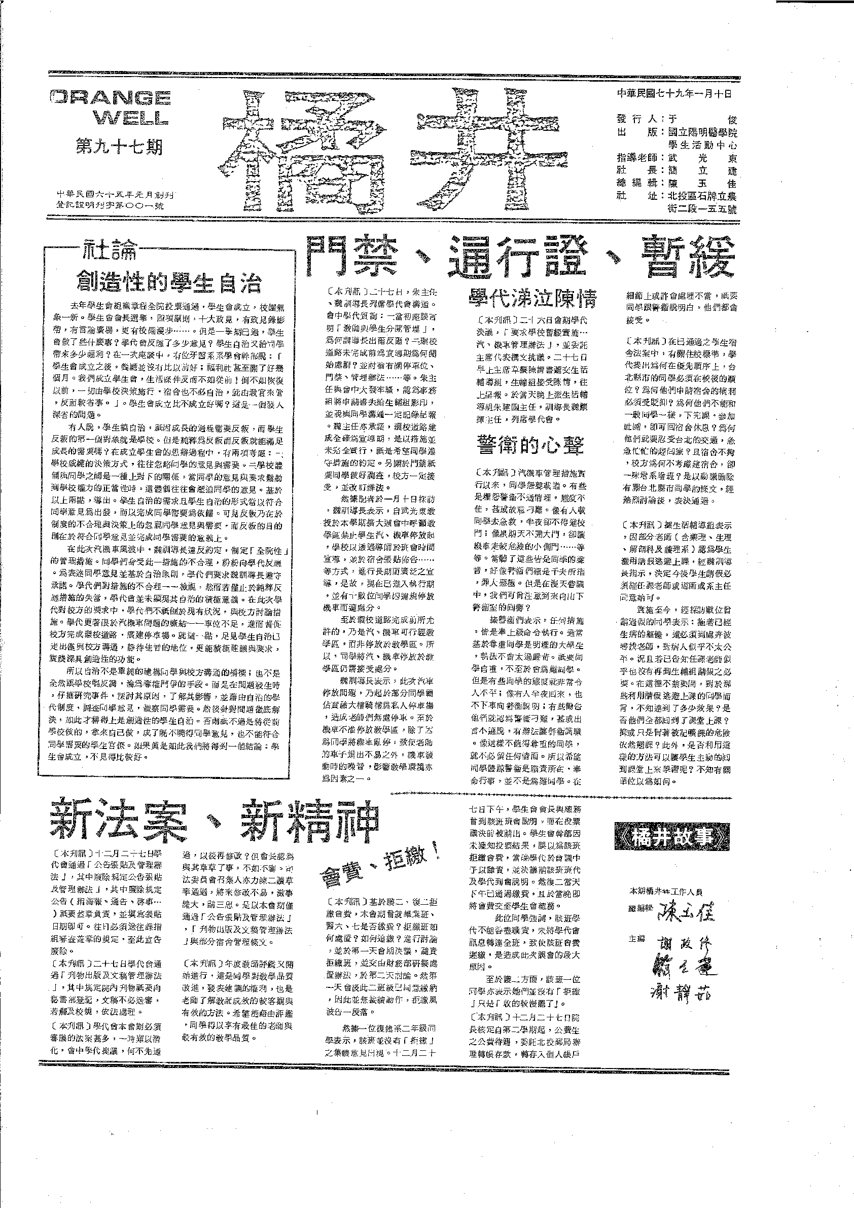 橘井 第92期。內含:醫技十年院慶逢系慶、國立陽明醫學院大學部學生會組織章程草案、給醫學系會長一封..